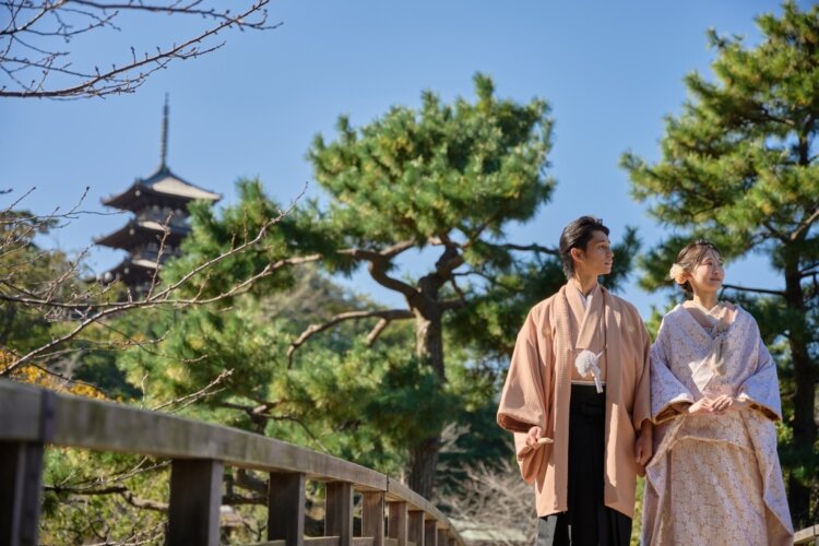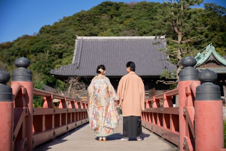 Shomyoji in Kanazawa, Yokohama, blends a Pure Land-style garden with historic buildings, creating a perfect spot for kimono pre-wedding photos.