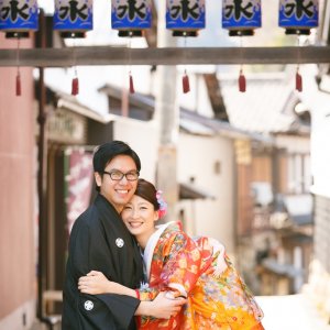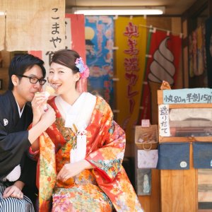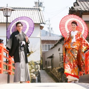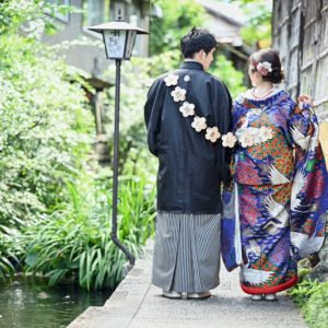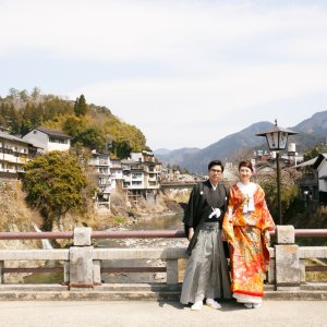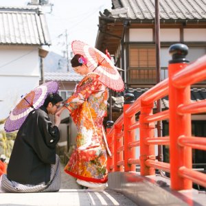 With cobblestone streets, traditional lattice-windowed townhouses, and red bridges, the town offers the perfect backdrop for couples in traditional Japanese attire.