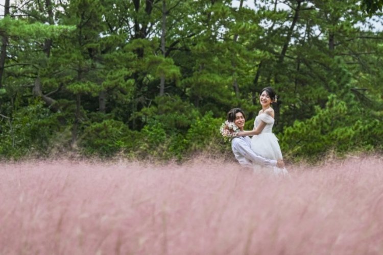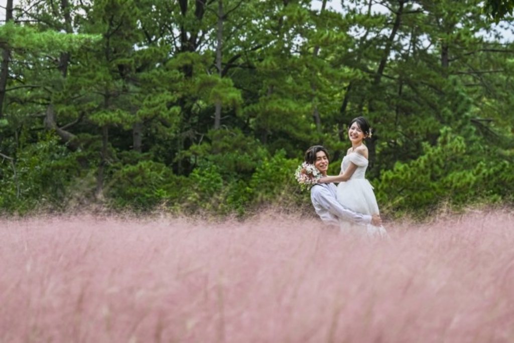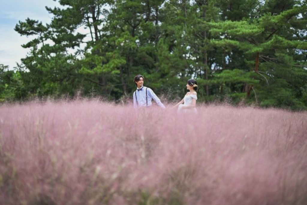 In autumn, the field transforms into a sea of pink pampas grass (Muhlenbergia capillaris), a must-see for pre-wedding photos!