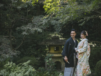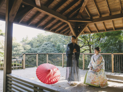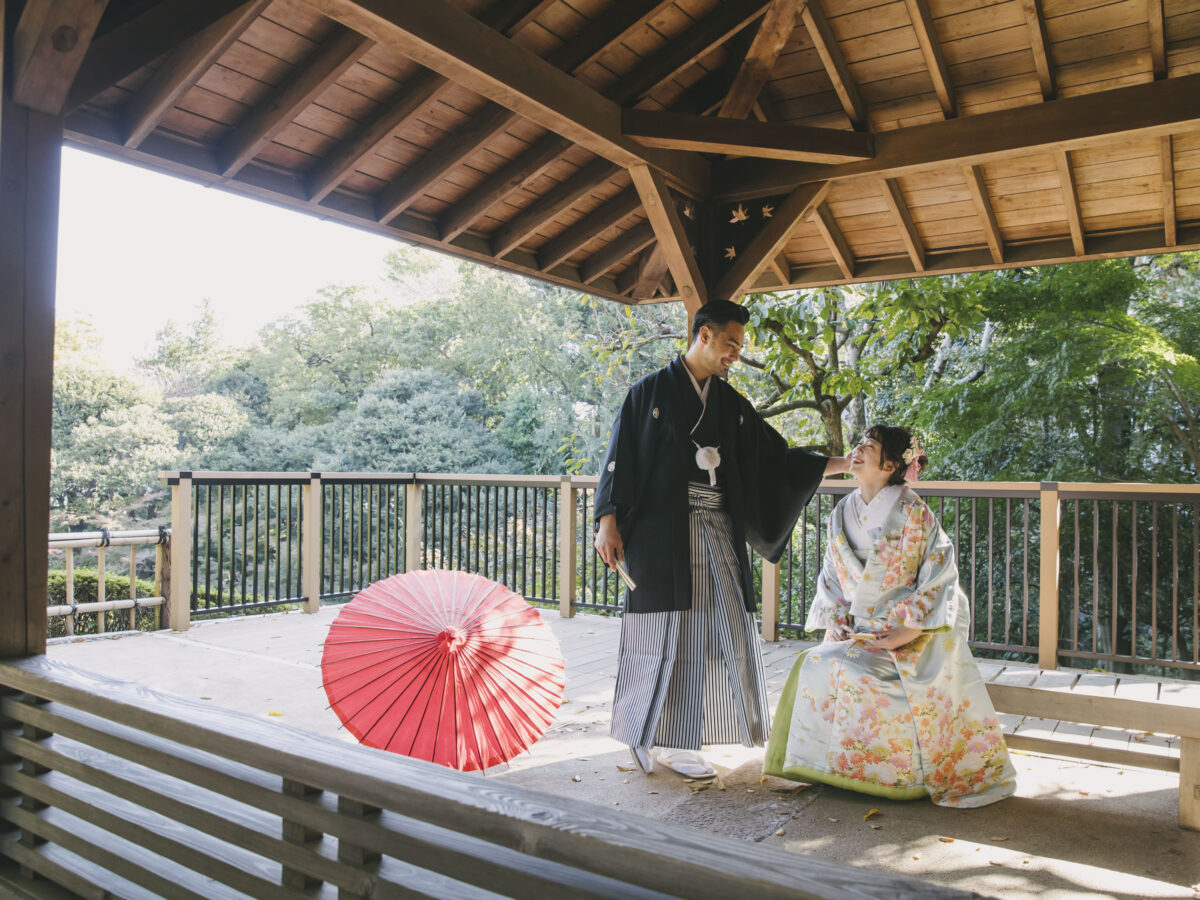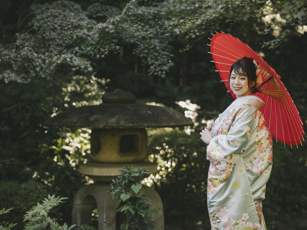 The wooden textures blend beautifully with the surrounding nature, creating an atmosphere that perfectly suits traditional Japanese attire.