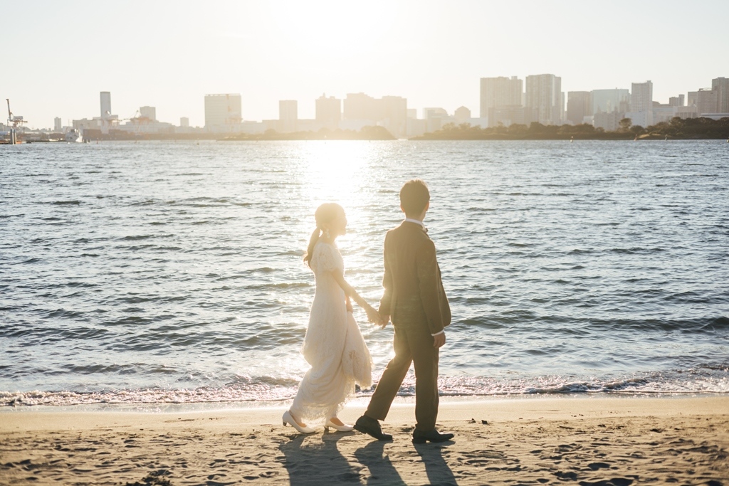 Dream beach photoshoot with stunning Tokyo Bay view.