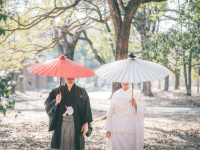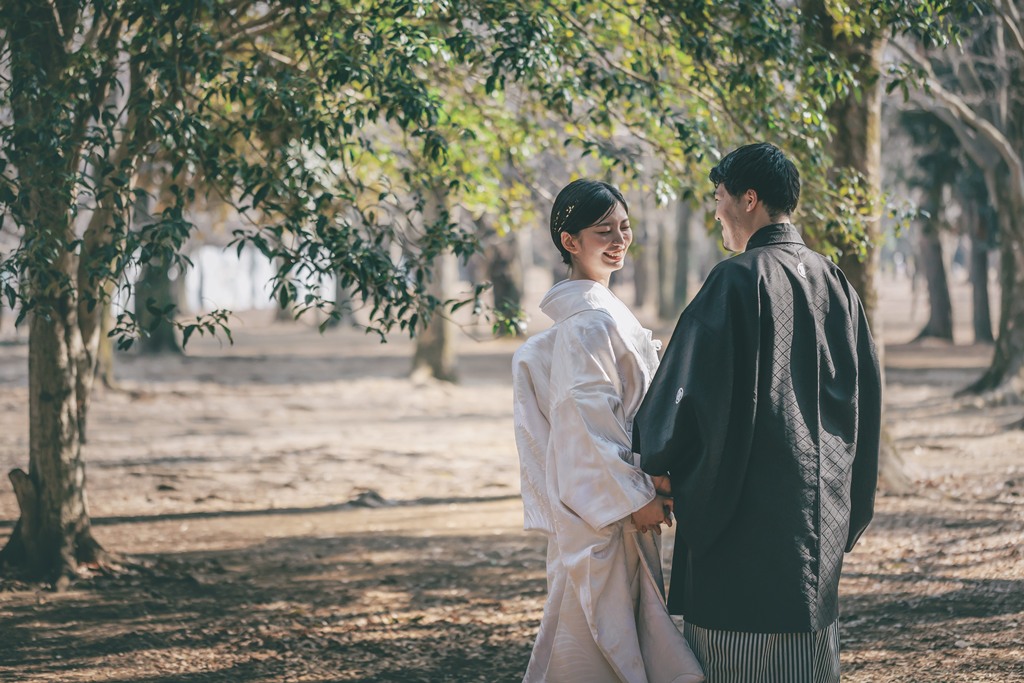 A bride in a white kimono under dappled sunlight looks especially striking, with the contrast highlighting serene beauty.