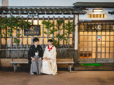 Photo Data: 200 cuts / Iro-Uchikake (Color Kimono) or Shiromuku (White Kimono) / Montsuki (Men’s Kimono) / Hair & Makeup / Art Bouquet / Kimono Dressing / Kimono Accessories / Professional Photographer / Hair & Makeup Attendant / Kimono Dresser / Photo Selection / Location Arrangement