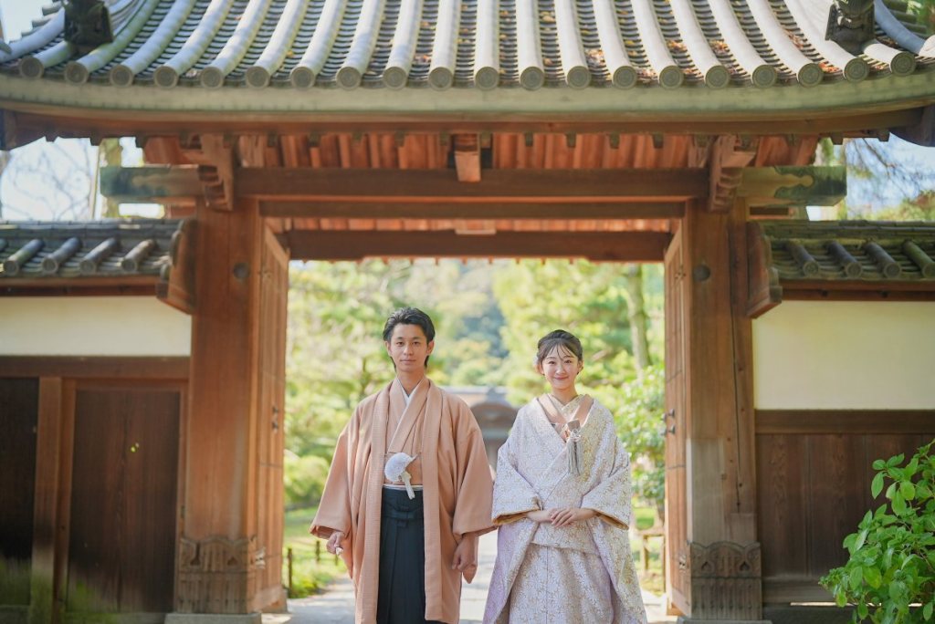 The gate’s elegant and calm atmosphere perfectly complements traditional wedding attire.