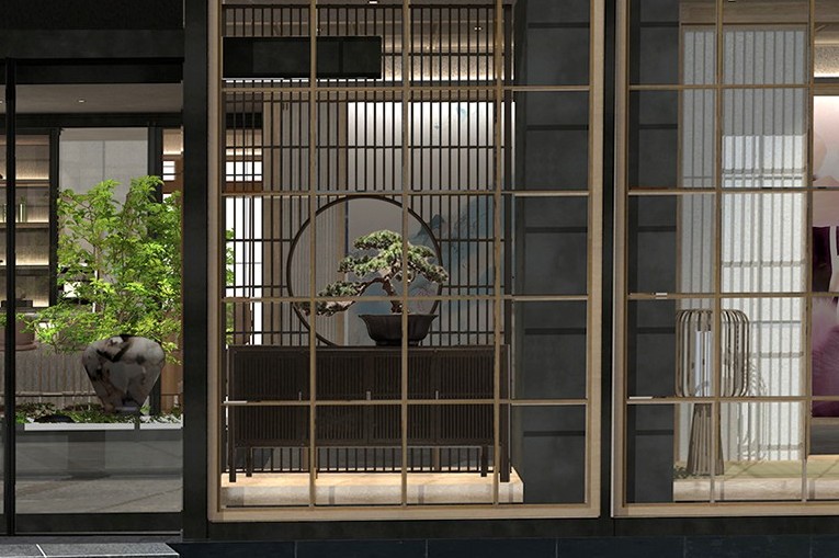 Seen through a delicate circular window, the pine tree reflects Japanese aesthetics. The composition creates a painterly, layered image.