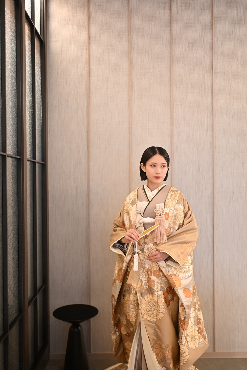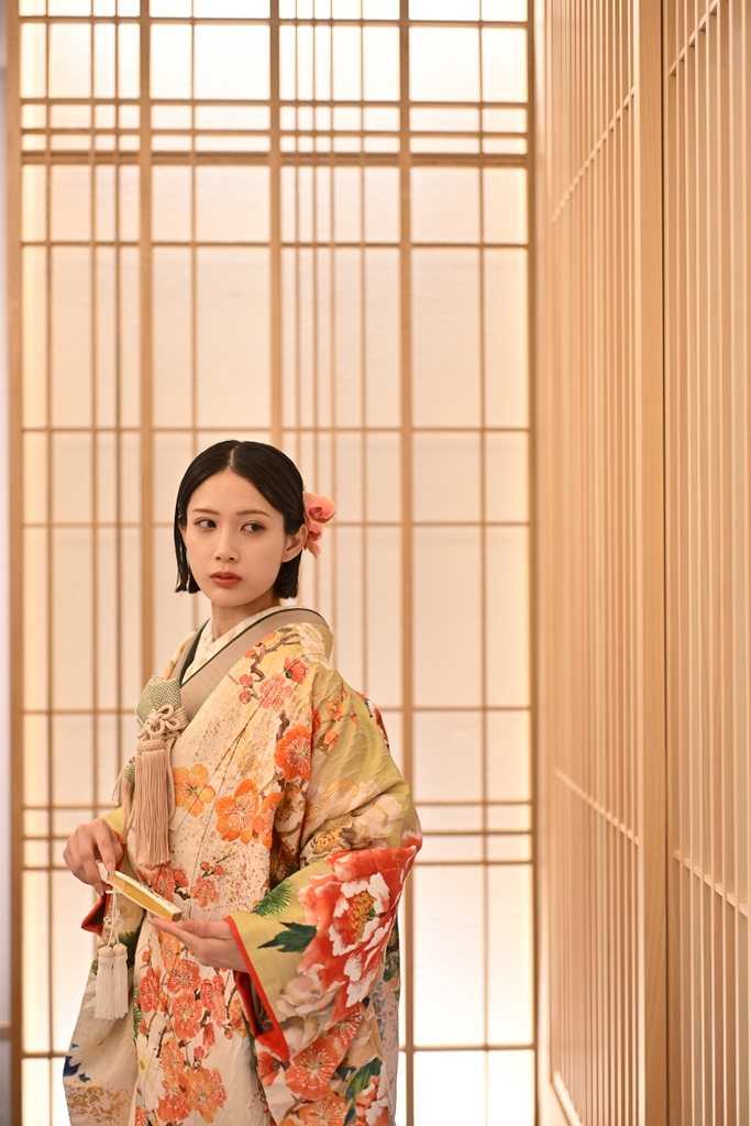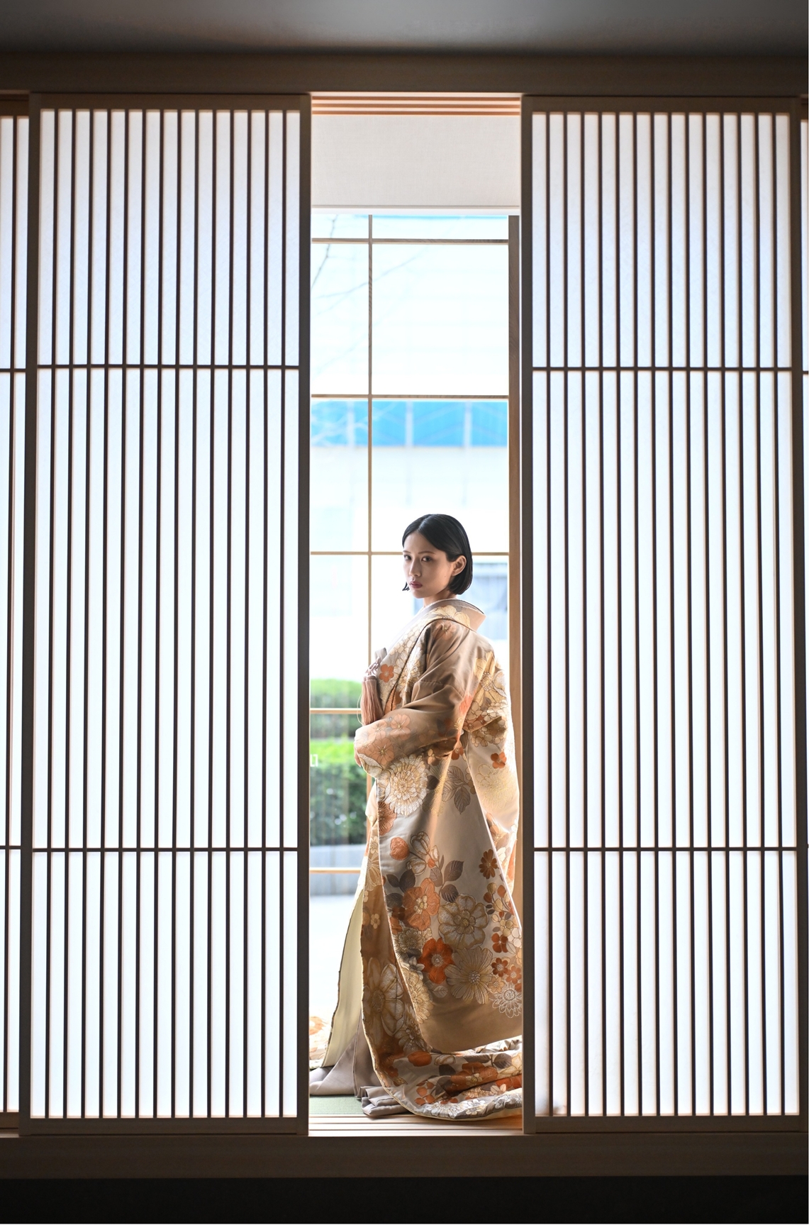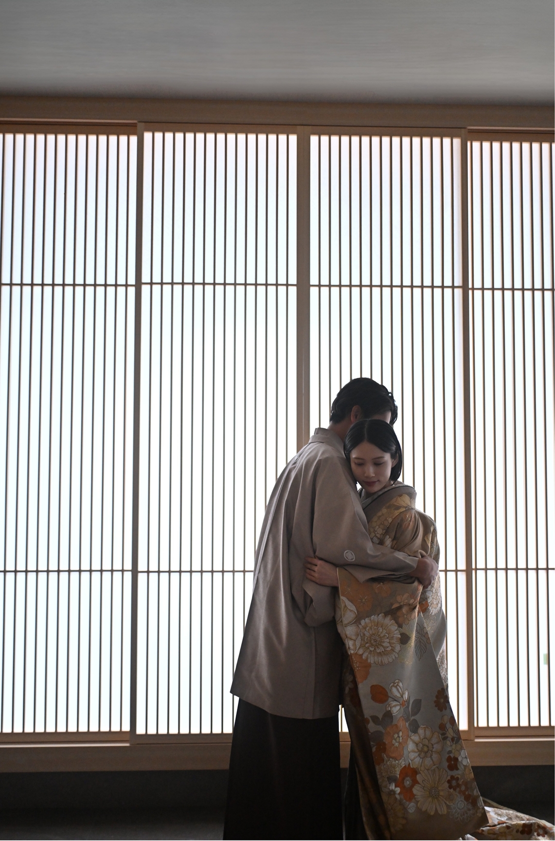 A striking lattice backdrop blends tradition and modernity, complementing both kimono and gowns while highlighting the couple’s presence.