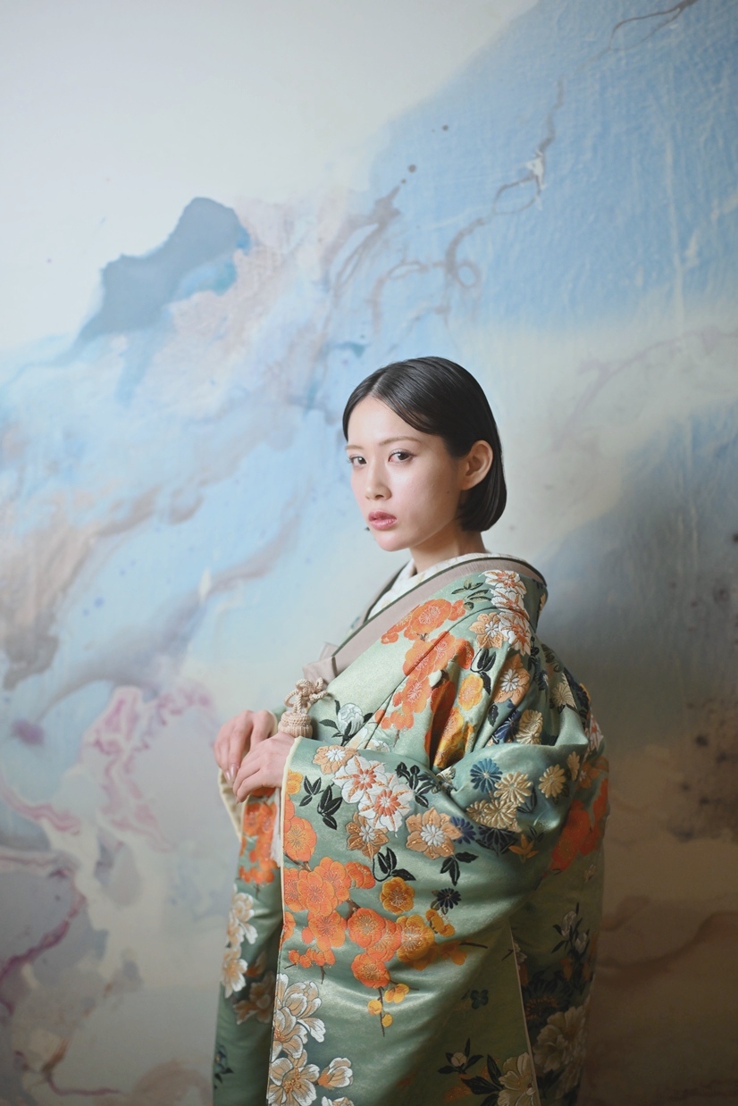 Delicate and feminine like makeup, this abstract art enhances the senses. Gentle curves and colors harmonize with bridal attire, bringing out refined femininity.