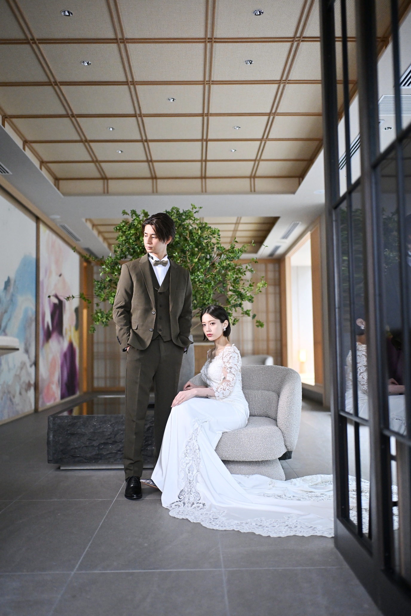 This Zen-inspired room highlights the beauty of simplicity. The couple’s presence stands gracefully in stillness, elevating the elegance of traditional attire.