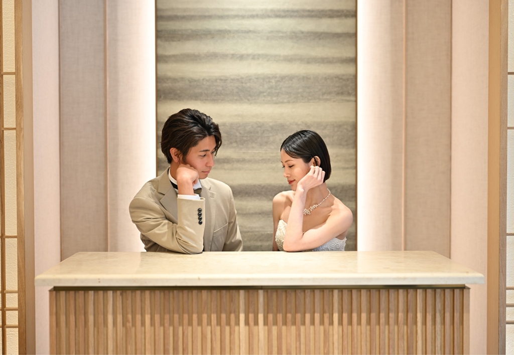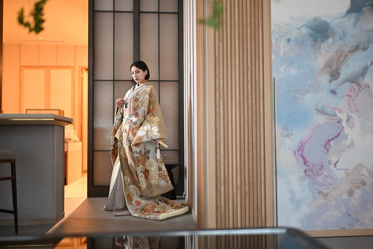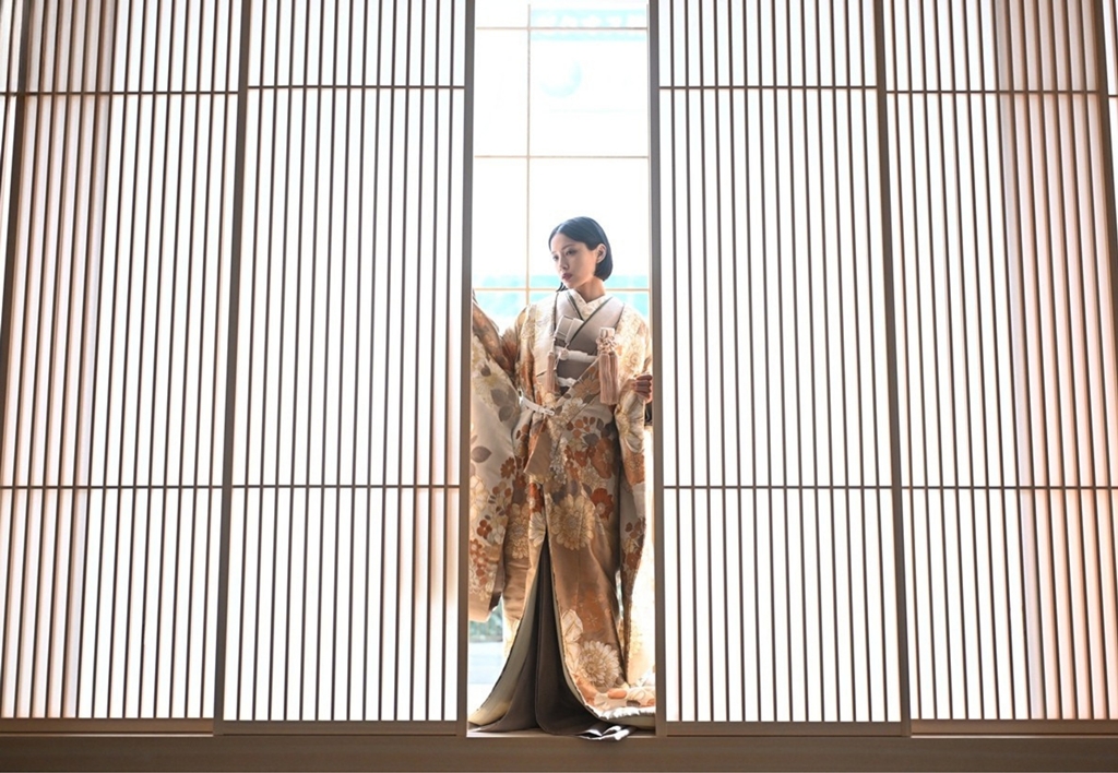 A refined Japanese-style photoshoot set in a space where tradition and modern design harmonize. Classic elements like tatami rooms, a round window, and pine accents blend with contemporary art backdrops, creating elegant yet fresh images. This experience captures the graceful beauty and subtle warmth of traditional attire in a striking pre-wedding shoot.