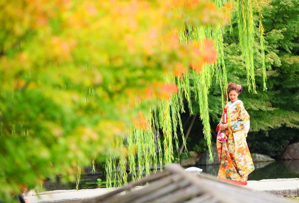 While there are many scenic spots that complement traditional wear, the imagery with Tokugawaen’s willows is truly captivating.