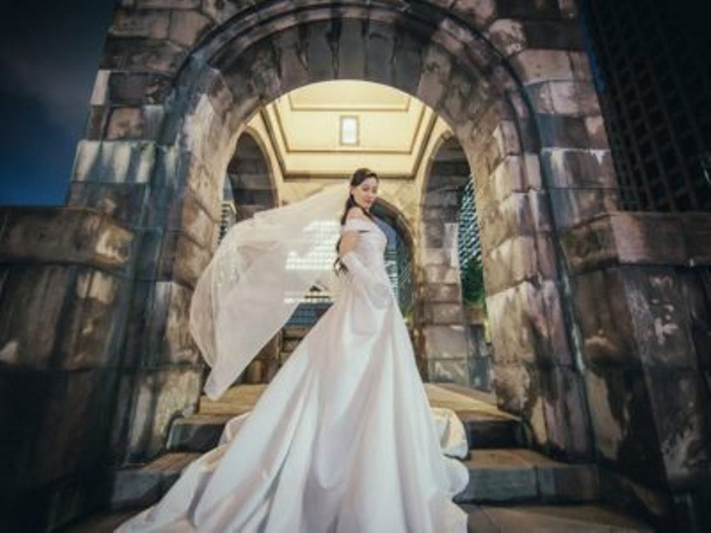 This photo features its exterior as the backdrop. The antique-style streetlights that softly glow at night, the arched windows, and the parallel, neatly designed white walls make for an outstanding background! Its versatility in matching any attire is also a delightful point.
