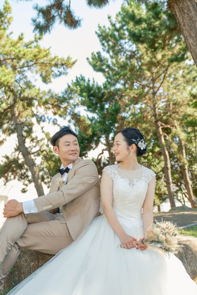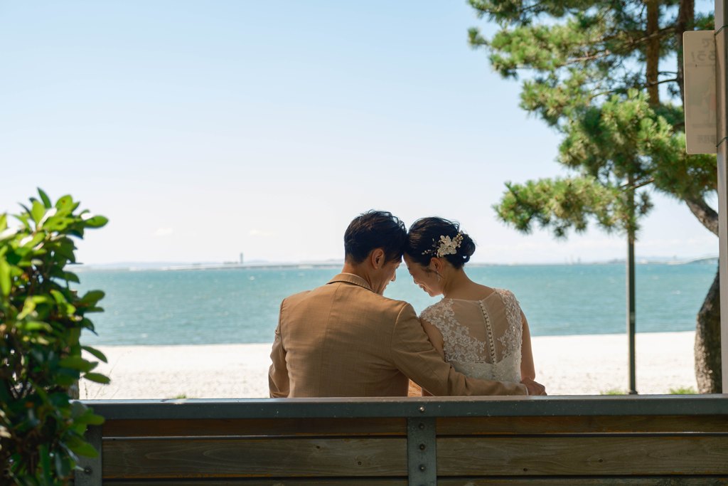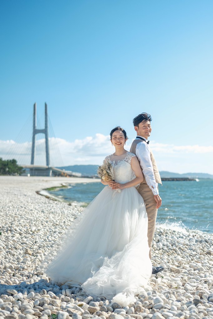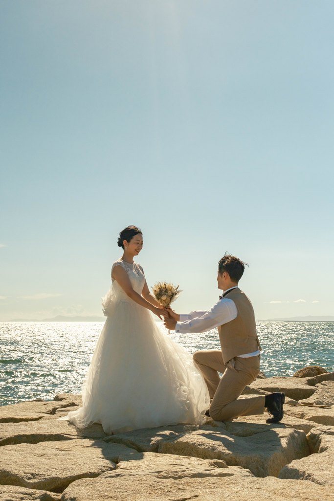 From the moment you stepped onto Marble Beach, the beautiful scenery of white stones and blue sea spread out before you, creating a magical, otherworldly space where your smiles shone even brighter. The sound of the waves and the gentle sea breeze, combined with natural light highlighting the beauty of your outfits, made every moment of your shoot perfectly photogenic.Our entire staff devoted themselves to capturing your natural expressions and the warm glances you shared with each other. Every smile, every joyful moment, and every scene set against the calm ocean will surely remain as a treasured memory.