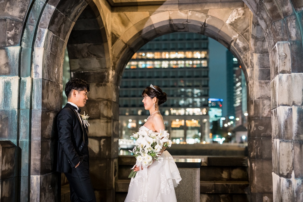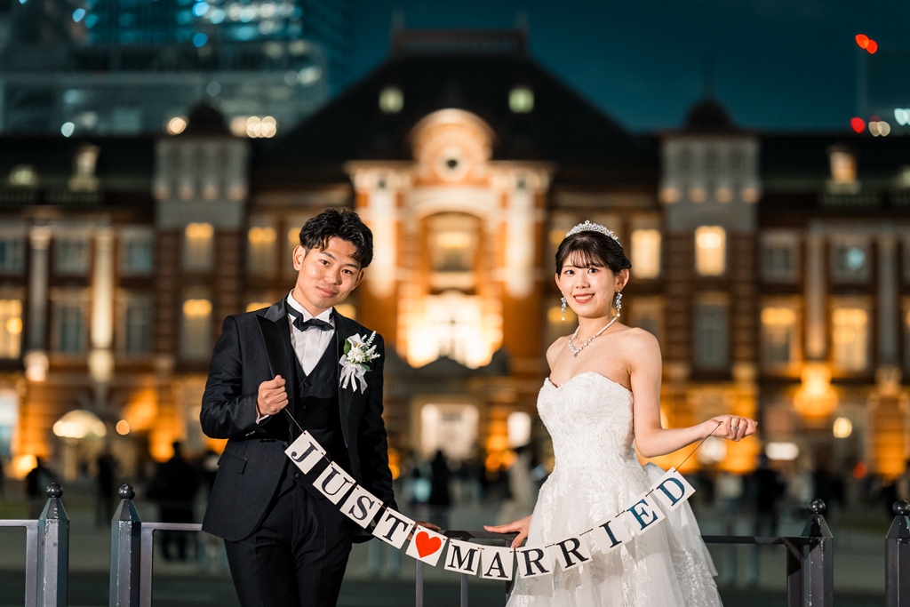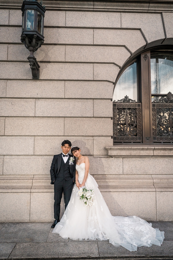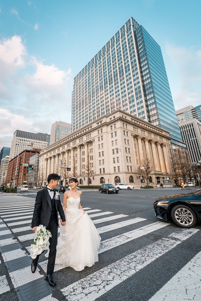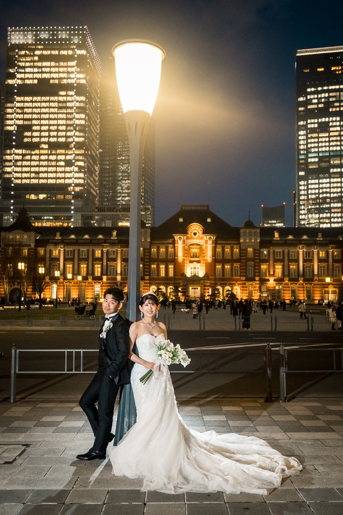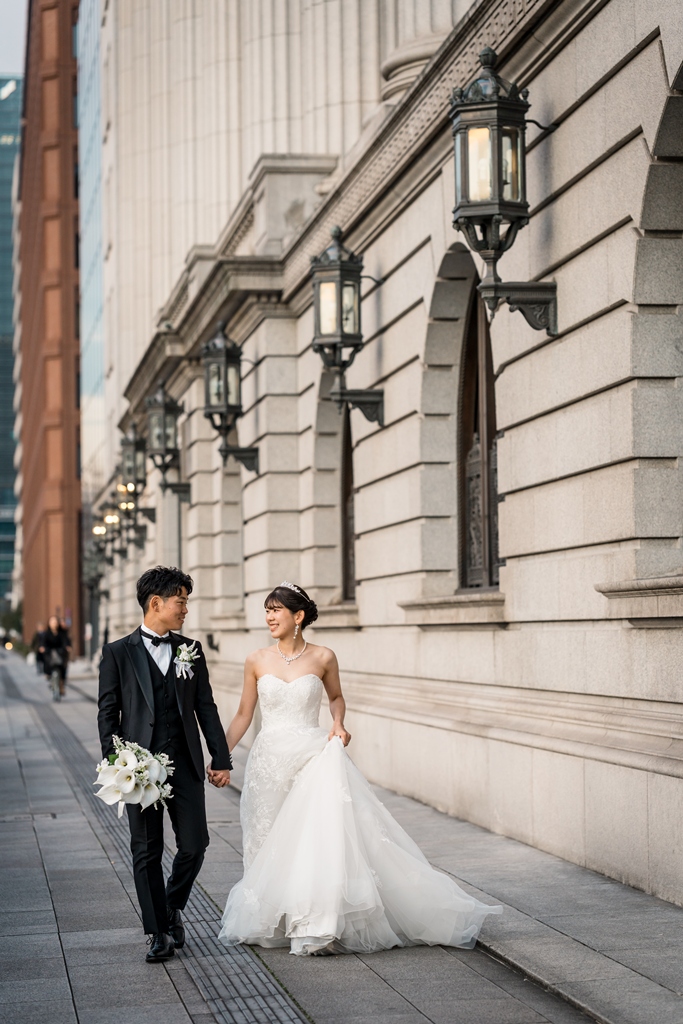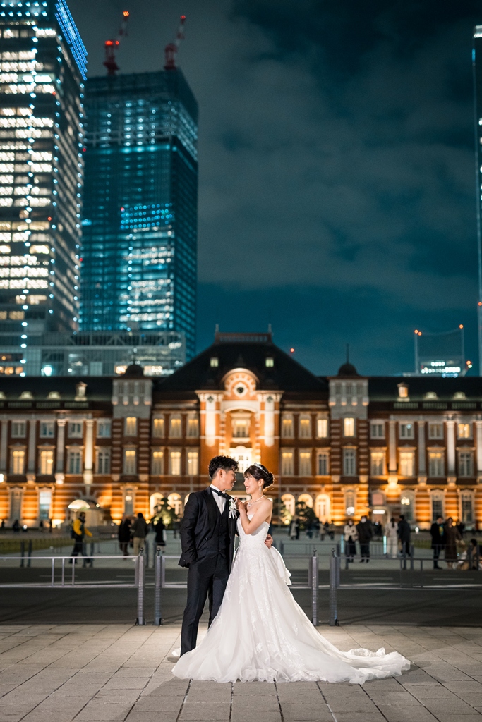 Thank you for your hard work during your Western-style location photoshoot at Tokyo Station. The bride’s wedding dress, with its sophisticated design and elegant silhouette, was stunning and harmonized perfectly with her gentle smile. The groom looked so refined in his tuxedo; together, you both looked like a glamorous scene from a movie. The historic beauty of Tokyo Station’s red brick architecture and the modern cityscape further enhanced your Western attire. The soft natural light during the day, the warm light at dusk, and the nighttime illuminations dramatically colored your special moments. Throughout the photoshoot, your natural gestures and happy smiles radiated the anticipation of a bright future together, and our staff wholeheartedly captured each moment. The finished photographs will undoubtedly become cherished treasures, beautifully depicting your precious story. We sincerely hope you enjoy sharing these special memories with your family and friends for years to come. We are deeply grateful that you entrusted our studio with your Western-style photoshoot at Tokyo Station from among many options. Our entire team sincerely wishes you both a future filled with happiness and radiant smiles, just like today.