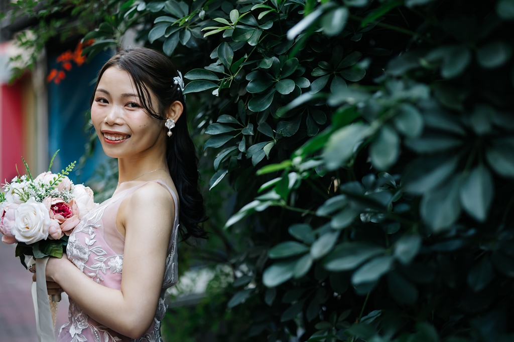 In the Western-style studio, I liked the floral background and the blue walls that went well with the pink dress and its counterpart color.