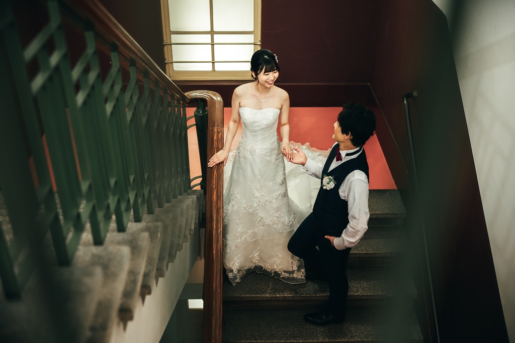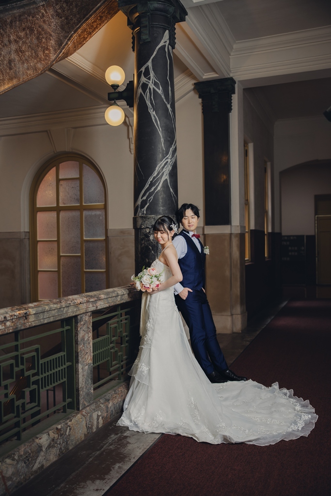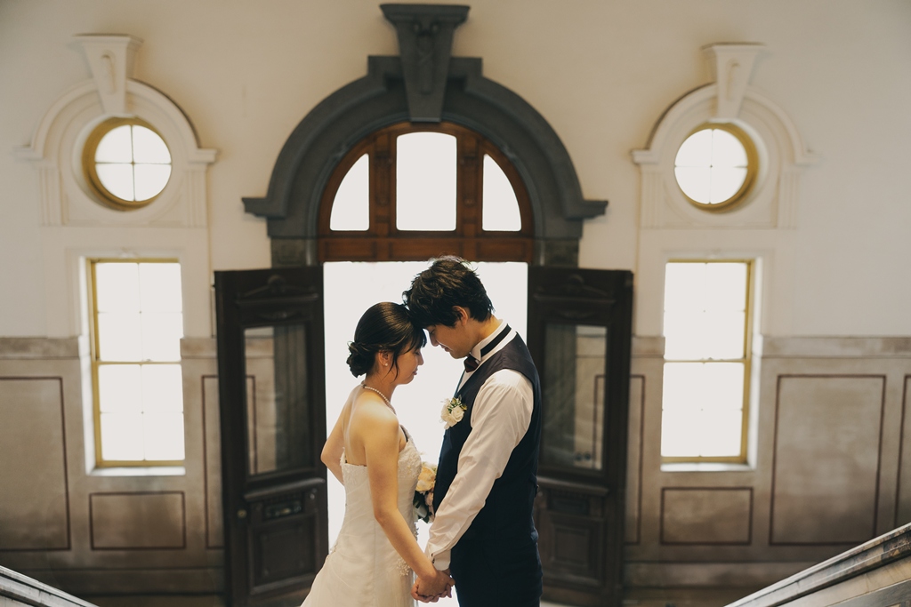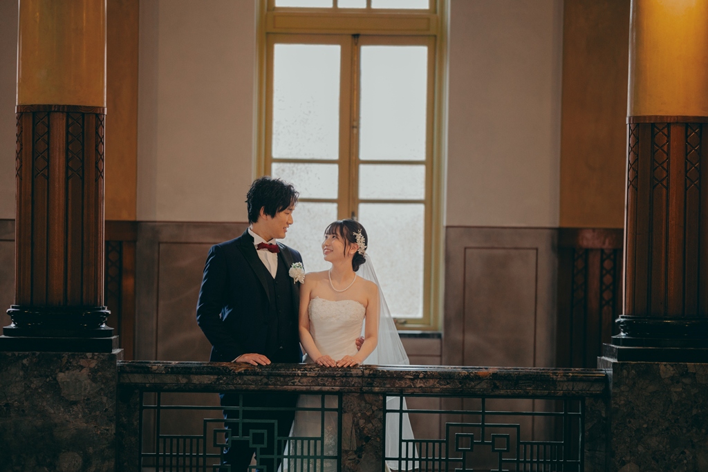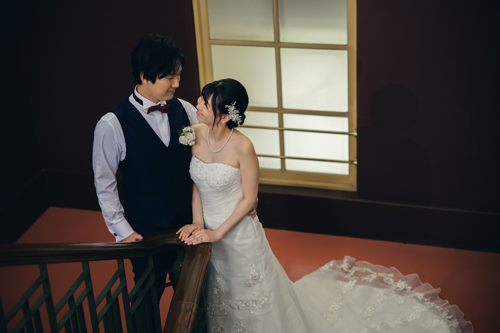 The building’s rich Taisho-era romance made the entire space feel like a scene from another time, almost as if we had stepped into a dream. Dressed in your gown and tuxedo, you both stood out like shining stars against this nostalgic backdrop.From the gentle glance exchanged at the top of the staircase, to the quiet connection beneath a grand column, to the soft touch of your hands by the sunlit window—each moment overflowed with the unique tenderness and bond you share. It was truly a joy for us to capture those emotions through our lens.