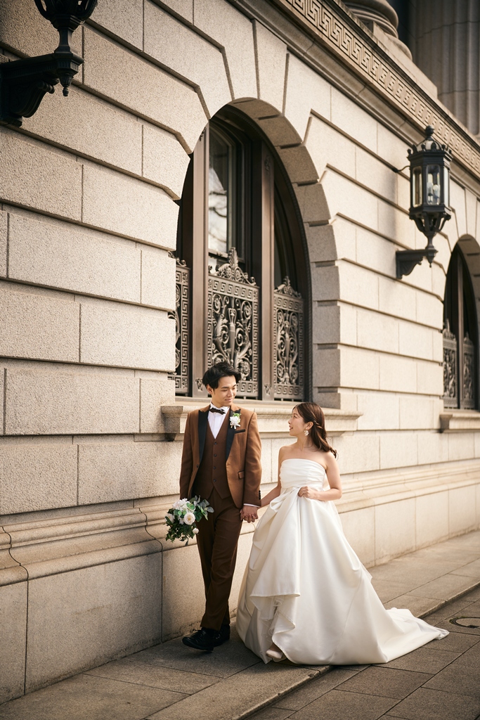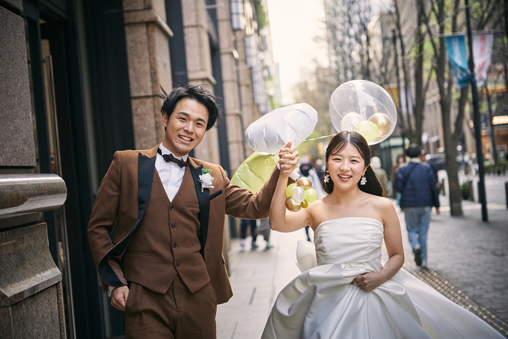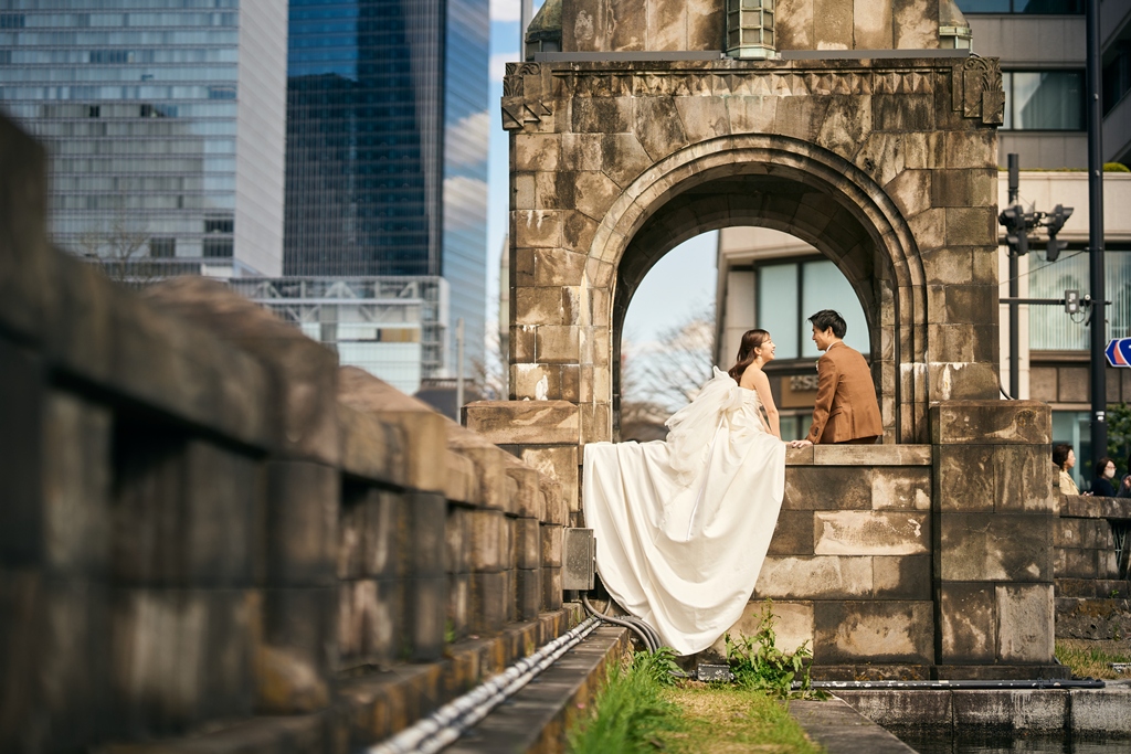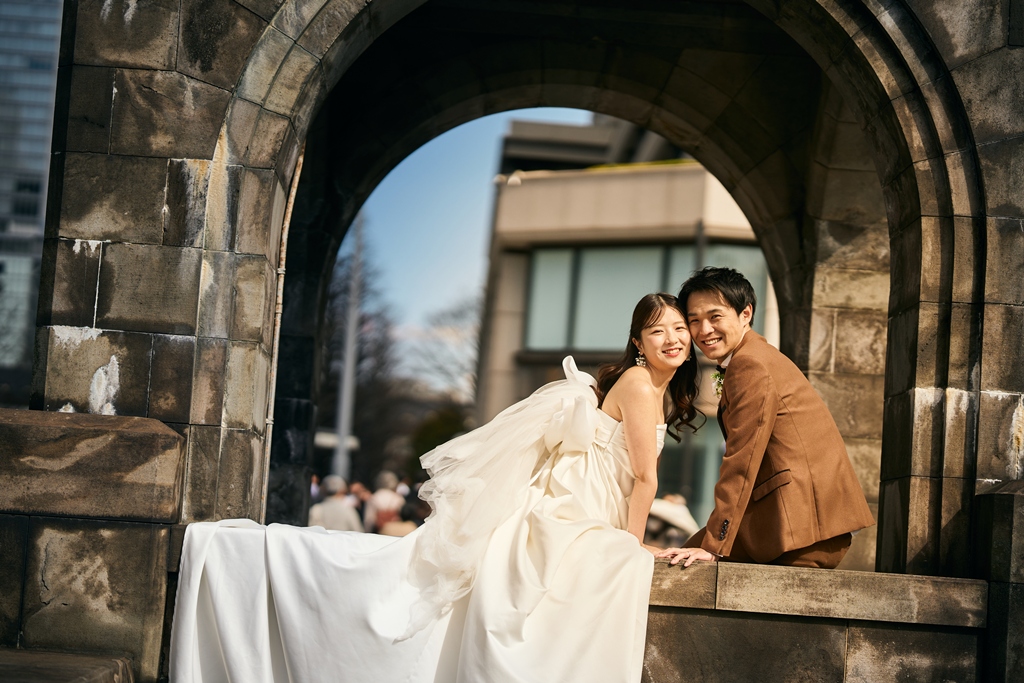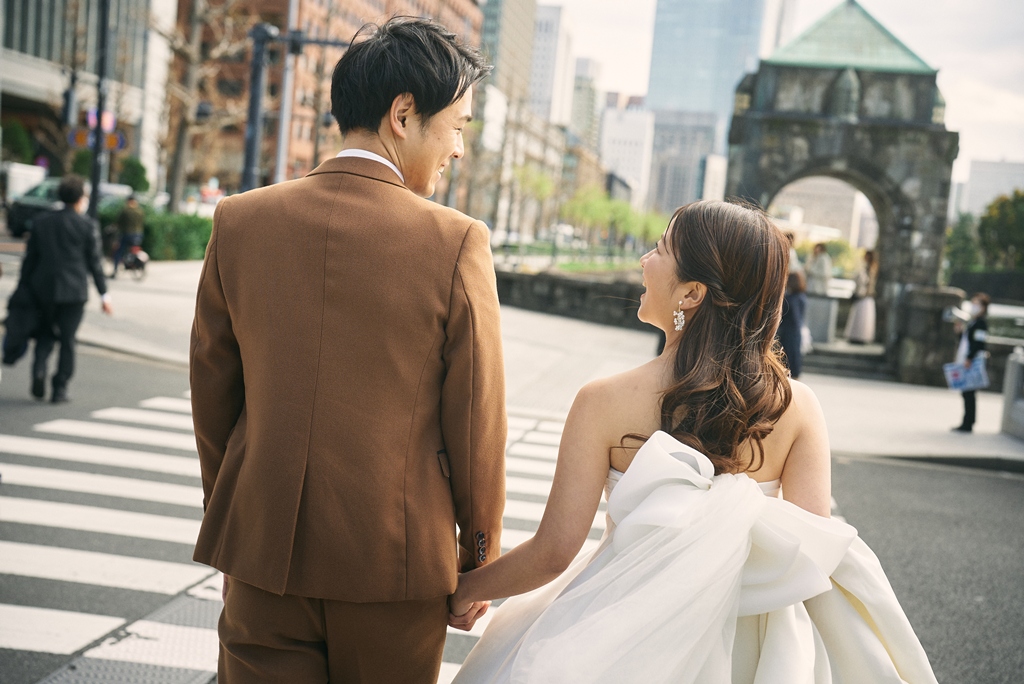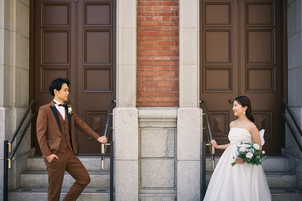 Tokyo Station’s red brick building stands as a symbol of history and elegance, while the surrounding Marunouchi district exudes modern sophistication. In this space where tradition and innovation meet, your presence in a wedding gown and tuxedo was breathtaking—like a scene from a movie. It captivated not just us, but everyone who witnessed it.