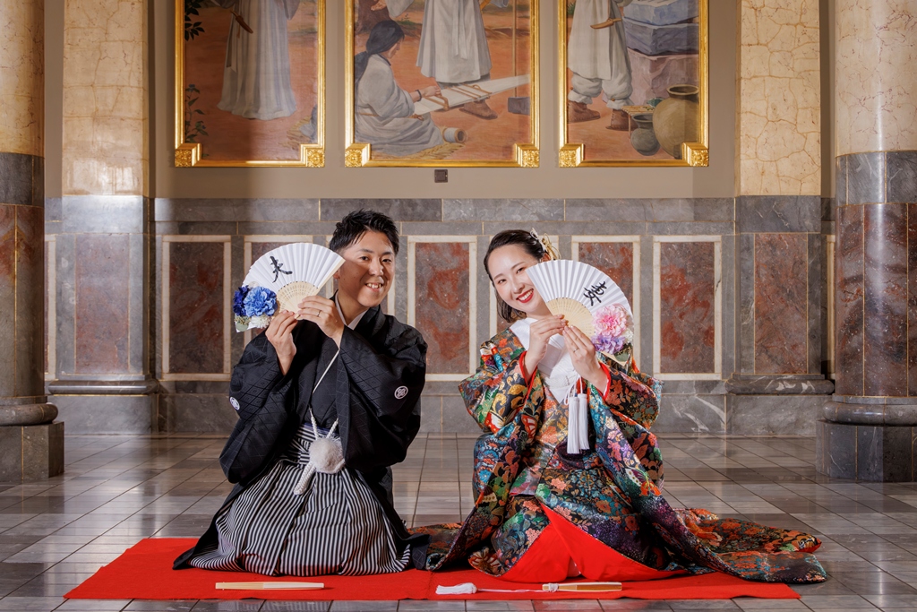 STAFF A word of thanks from the staff. We would like to sincerely thank you for choosing to have your Japanese kimono pre-wedding shoot at the Special Room of Osaka Central Public Hall. The time spent in this grand, historic, and elegant space became an unforgettable moment not only for you but also for us. Soft natural light poured in through the large windows, while the intricate decorations adorning the ceiling and walls further enhanced your attire. The rich colors of the uchikake and montsuki hakama blended harmoniously with the classic architecture, creating a unique beauty that made each moment shine like a painting. Throughout the session, every smile you shared and each gentle glance at one another became precious instants, now preserved forever in your photographs. This pre-wedding shoot was more than just a commemorative occasion—it became a significant chapter in the story of your lives together. The union of kimono elegance and historic architecture created a once-in-a-lifetime sense of beauty and emotion, and we are truly delighted to have been able to share it with you.