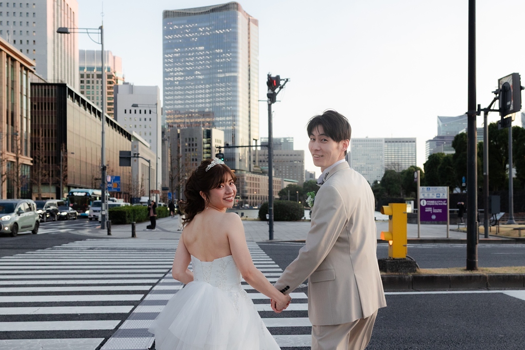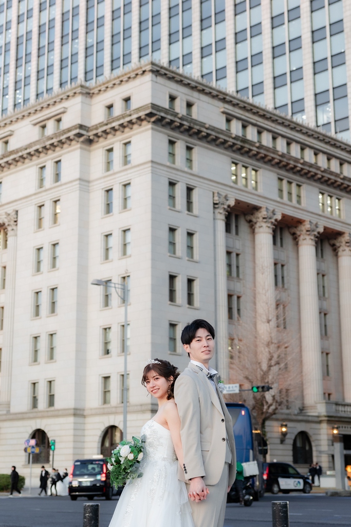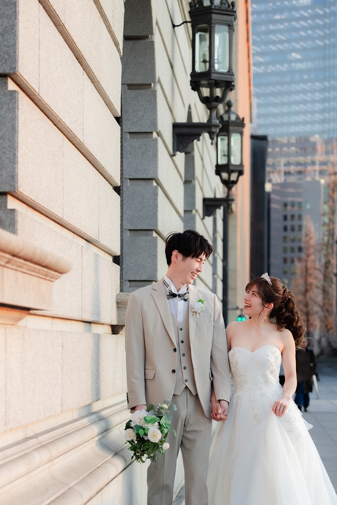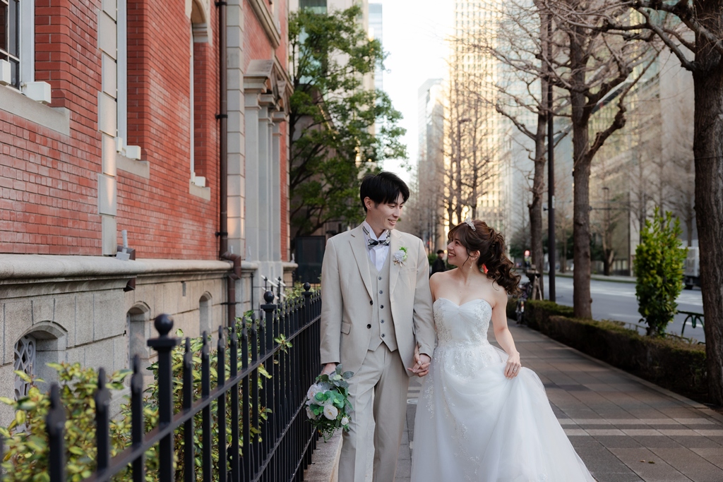 Your warm smiles, the way you held hands, and the glances you exchanged—all of it moved us deeply.Standing in front of Tokyo Station, a place rich in history, your presence in elegant attire seemed to beautifully harmonize with its timeless dignity.