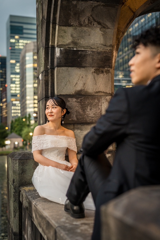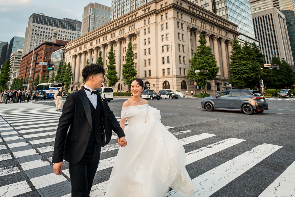 With its historical red-brick station building and refined cityscape, the Tokyo Station / Marunouchi area offers both elegance and splendor — the perfect stage for a Western-style wedding shoot. As the two of you walked through the streets in your wedding dress and tuxedo, each step felt like a moment straight out of a movie, touching our hearts again and again.