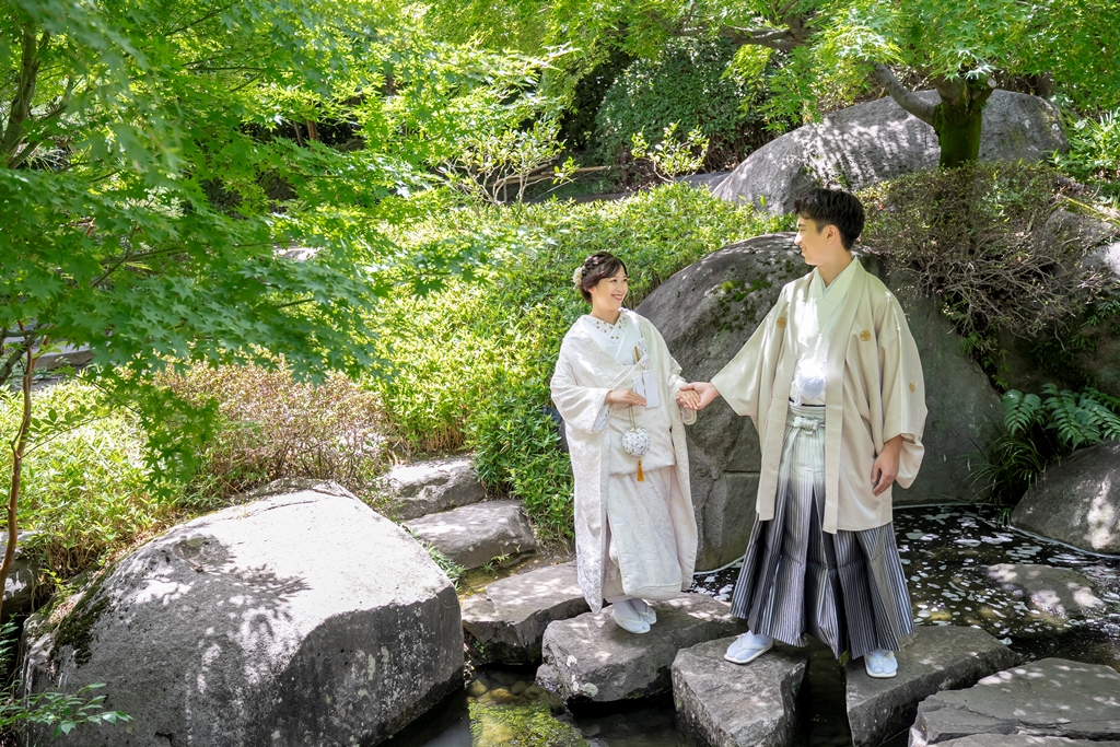The wooden veranda, stone pathways, reflections on the water, and soft streams of light through the trees—all elements unique to Mejiro Garden—gently embraced your story and brought it to life.We sincerely hope that this peaceful moment in such a meaningful place will continue to warm your hearts for many years to come.
