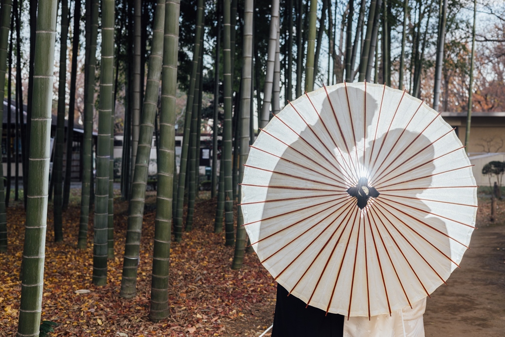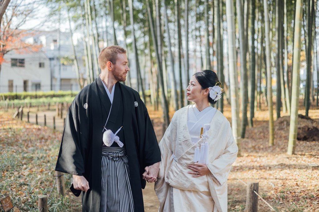 Japanese-style photoshoot at Rosoku Koushun-en with autumn leaves and bamboo forest as the backdrop. | Pre-Wedding Photography in Japan | WEDDING AVENUE