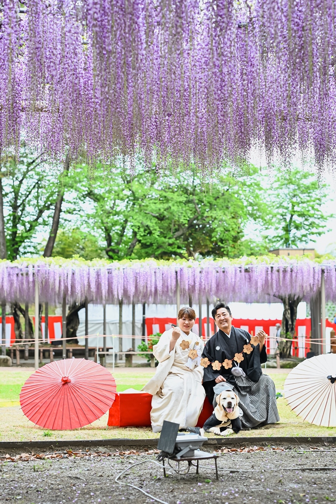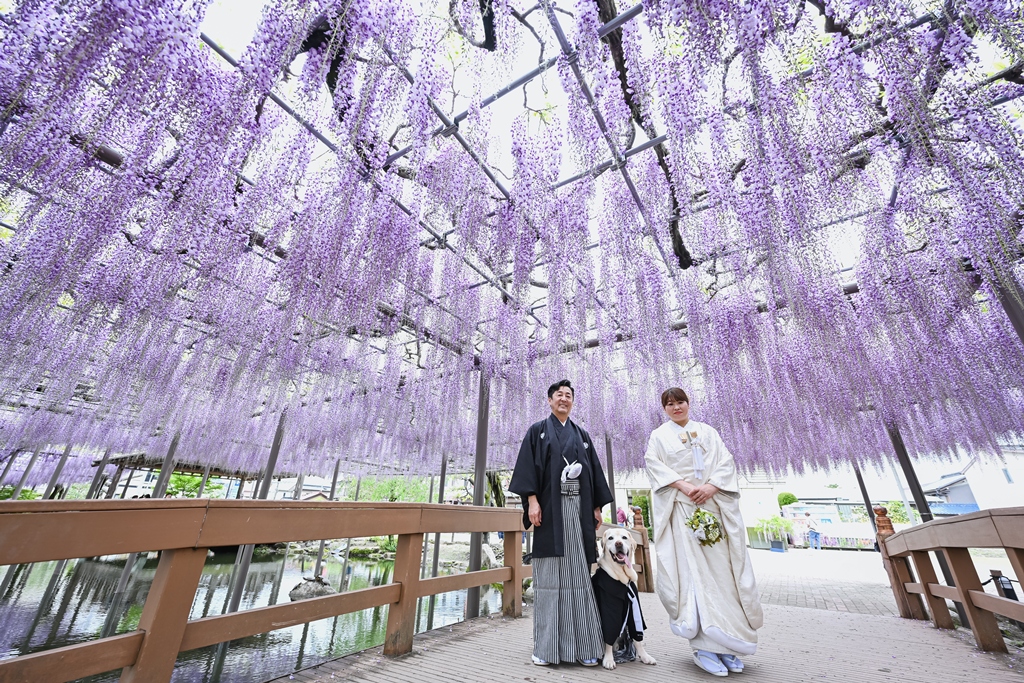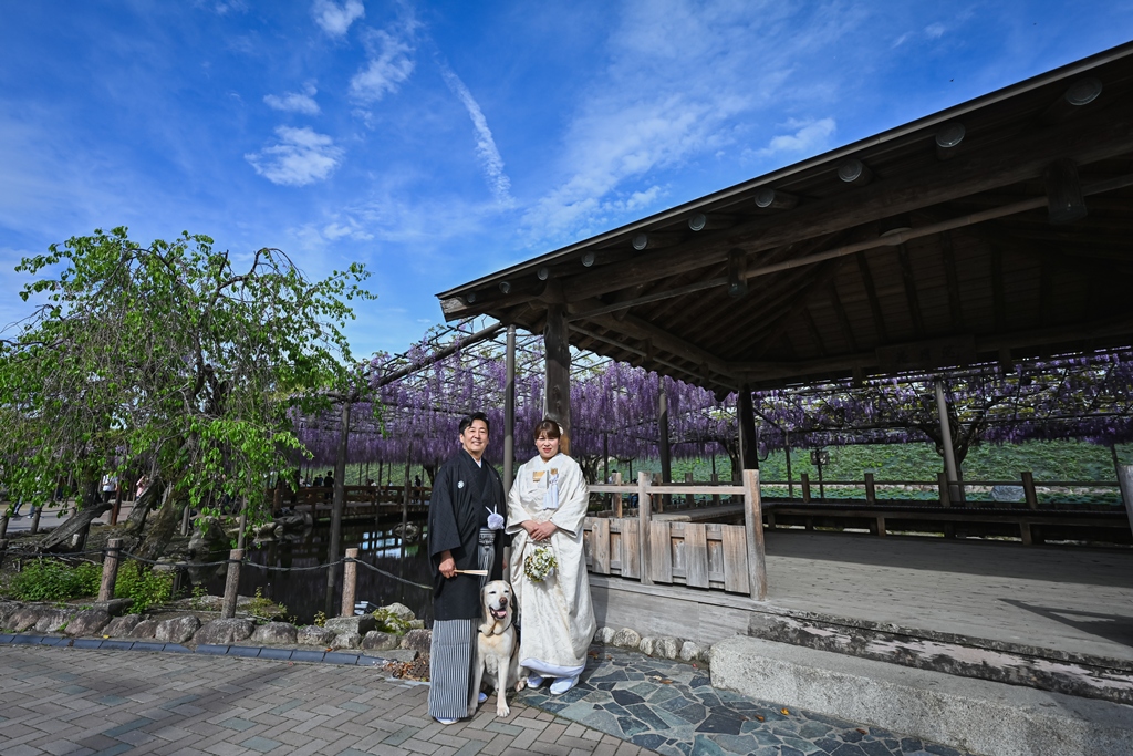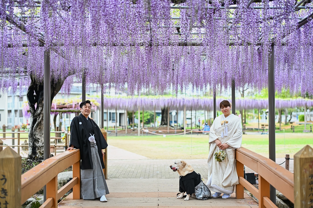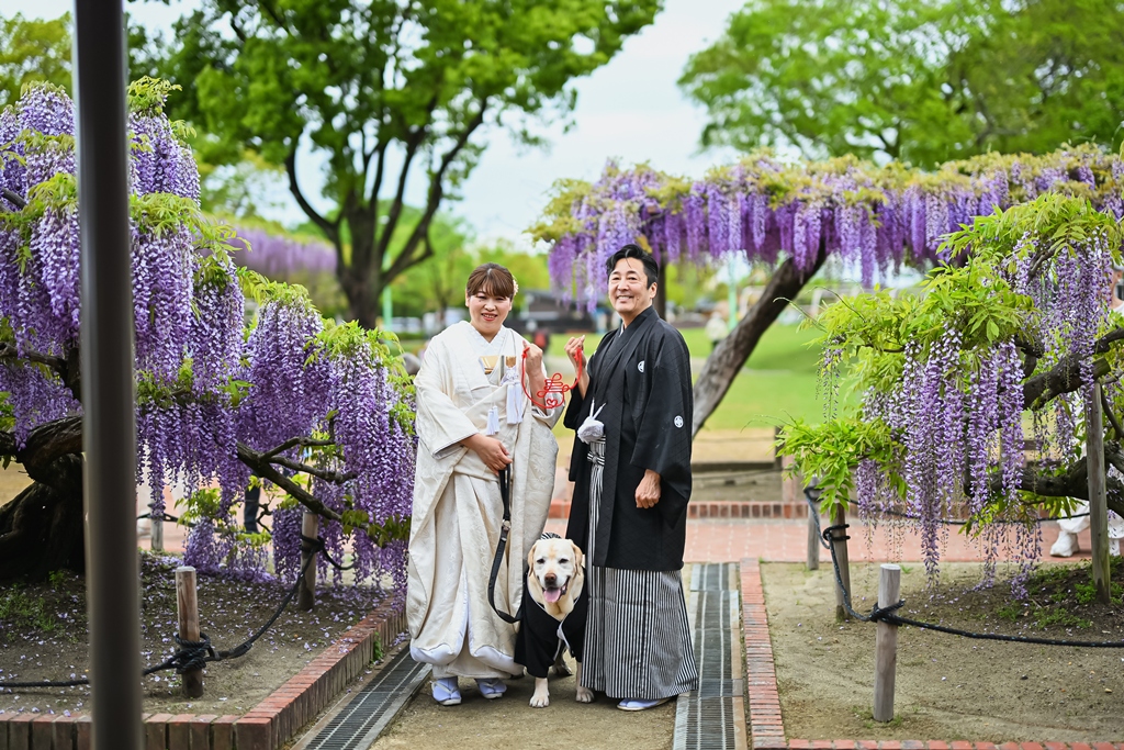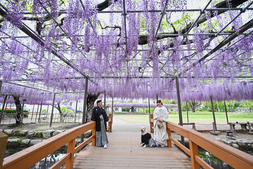 - The shoot was held at Tennogawa Park in Tsushima City, famous for its beautiful wisteria trellises, and was originally planned for mid-April, but was postponed one week because the wisteria was a little late. Rain was forecast for the day of the shoot, but by the time of the shoot, it had cleared up and we were able to shoot without incident. We were shooting with a large dog, but the staff was very kind and courteous. I am grateful that we were able to leave behind wonderful photos with memories.