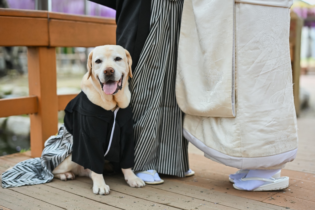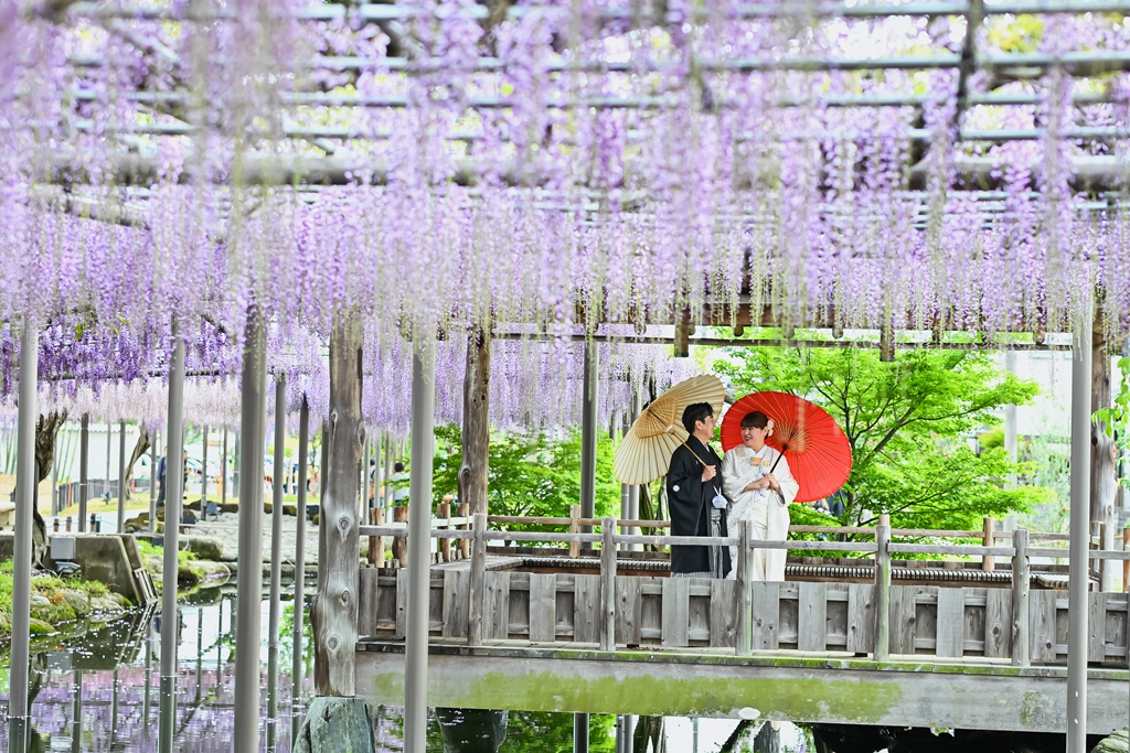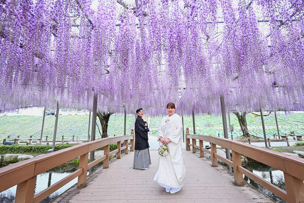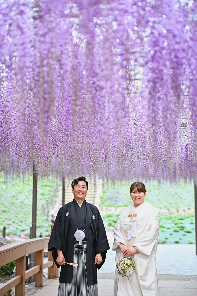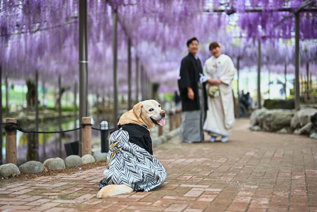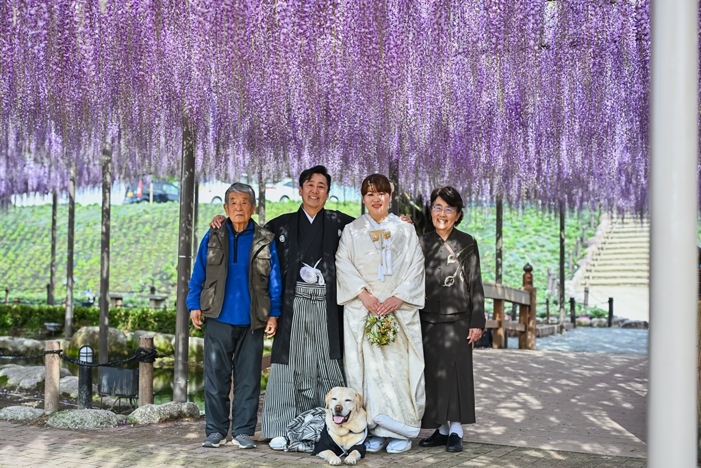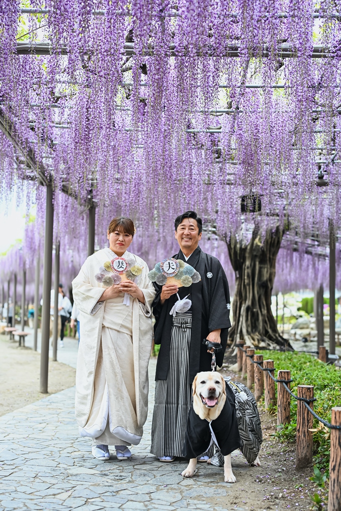 - The shoot was held at Tennogawa Park in Tsushima City, famous for its beautiful wisteria trellises, and was originally planned for mid-April, but was postponed one week because the wisteria was a little late. Rain was forecast for the day of the shoot, but by the time of the shoot, it had cleared up and we were able to shoot without incident. We were shooting with a large dog, but the staff was very kind and courteous. I am grateful that we were able to leave behind wonderful photos with memories.