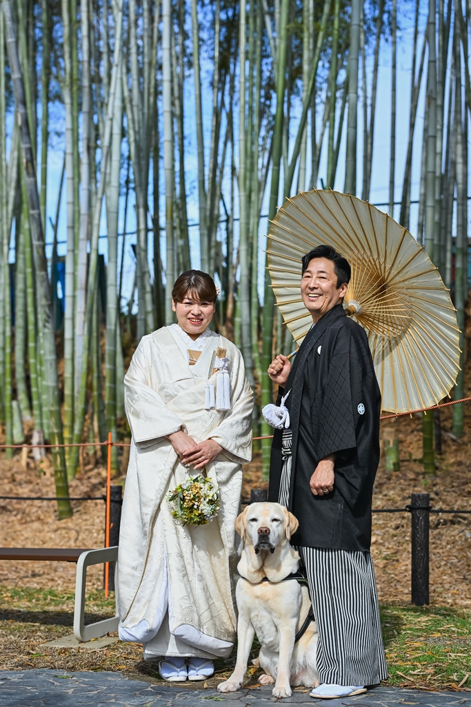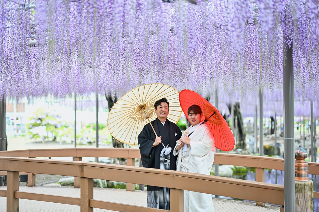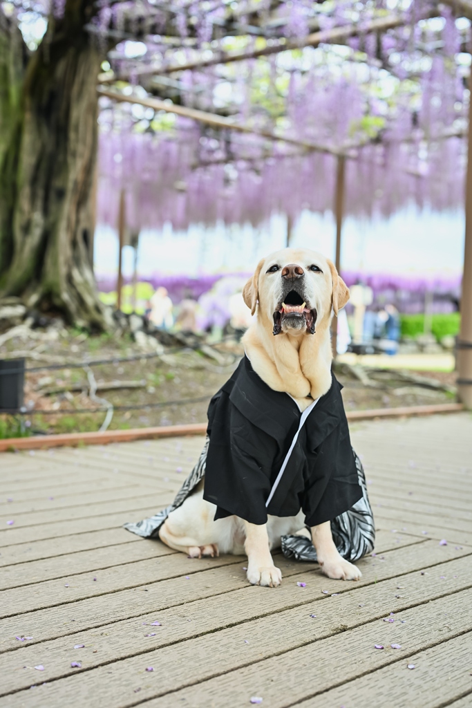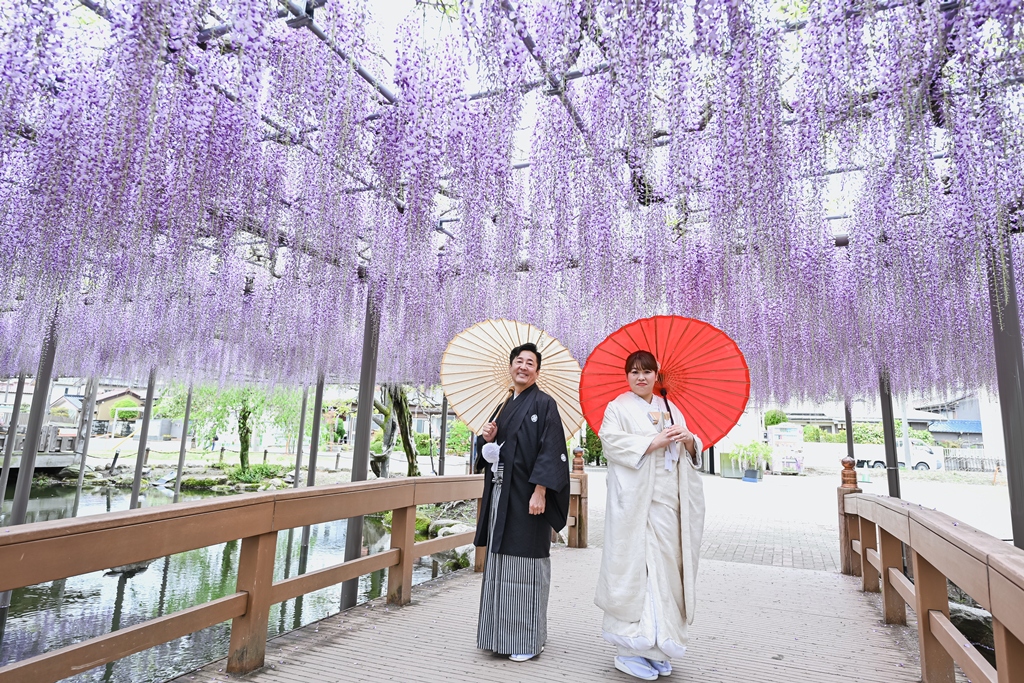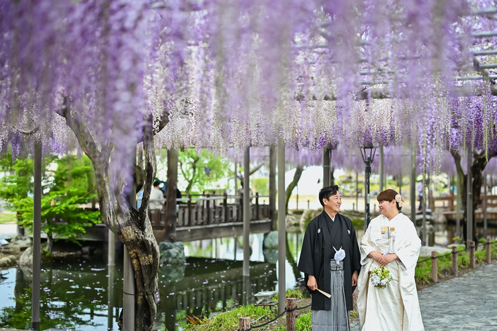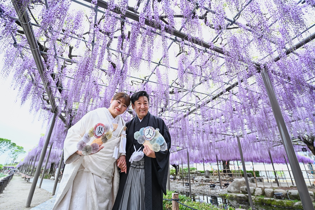 - The shoot was held at Tennogawa Park in Tsushima City, famous for its beautiful wisteria trellises, and was originally planned for mid-April, but was postponed one week because the wisteria was a little late. Rain was forecast for the day of the shoot, but by the time of the shoot, it had cleared up and we were able to shoot without incident. We were shooting with a large dog, but the staff was very kind and courteous. I am grateful that we were able to leave behind wonderful photos with memories.