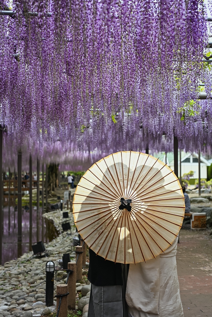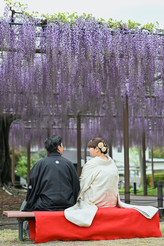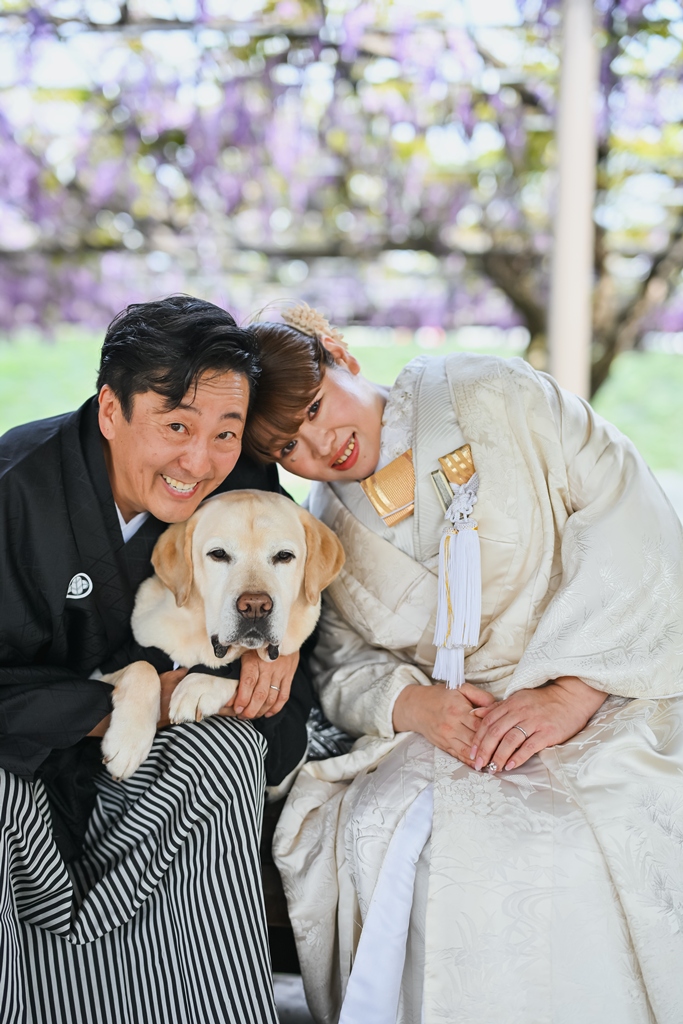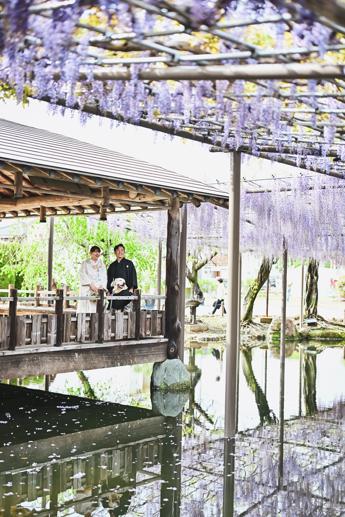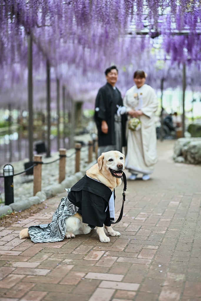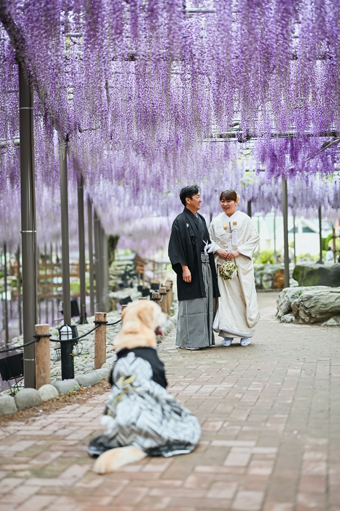 A Japanese-style wedding with your dog under the wisteria flowers that remind you of the season.