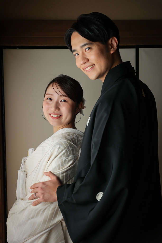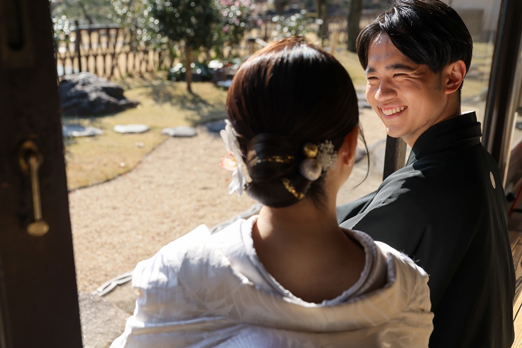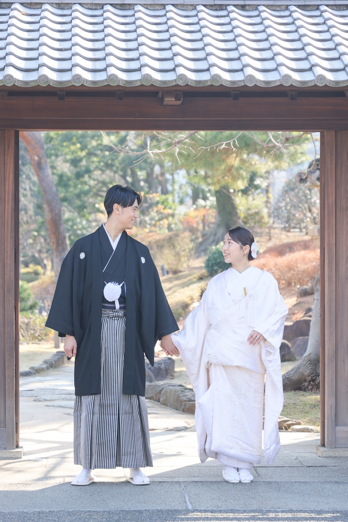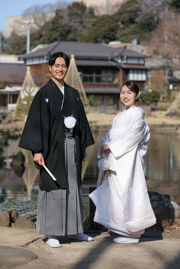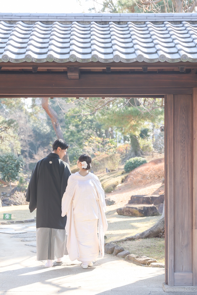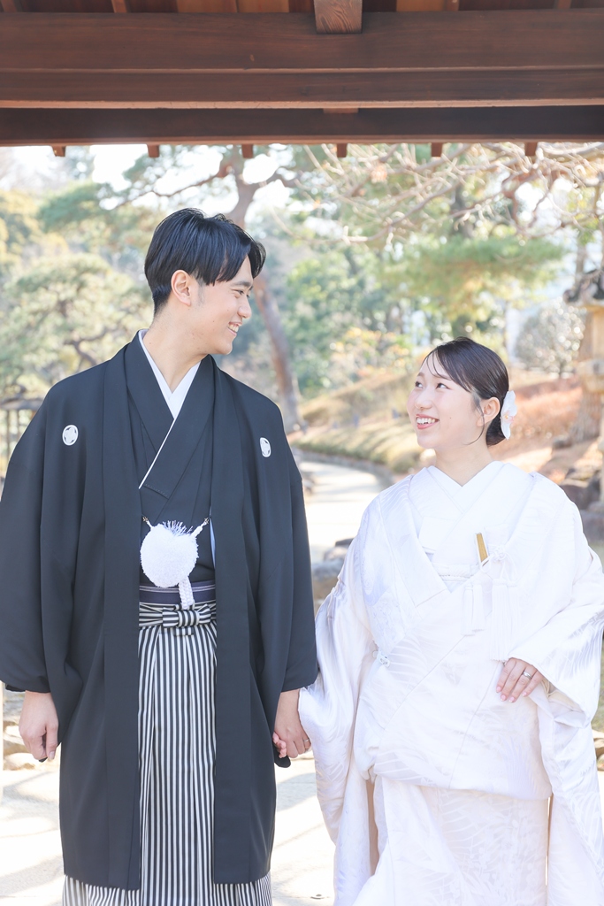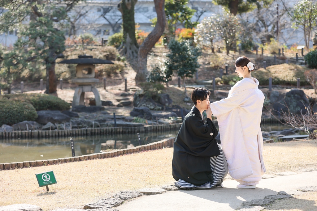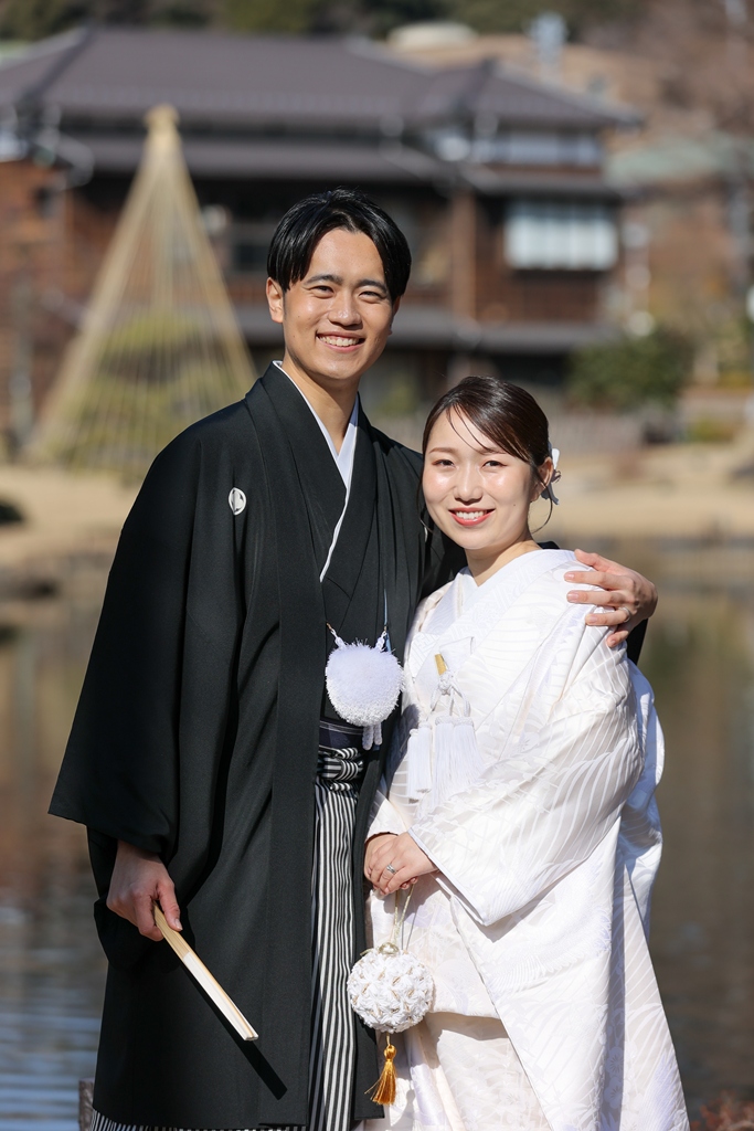 Thank you for choosing us for your beautiful kimono photoshoot at Higoso-Hosokawa Garden. The bride looked radiant in her vibrant iro uchikake and delicate hair ornaments – truly breathtaking. The groom looked so dashing in his montsuki hakama; together, you both perfectly embodied Japan’s beautiful traditions.