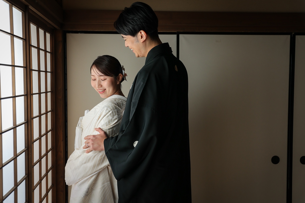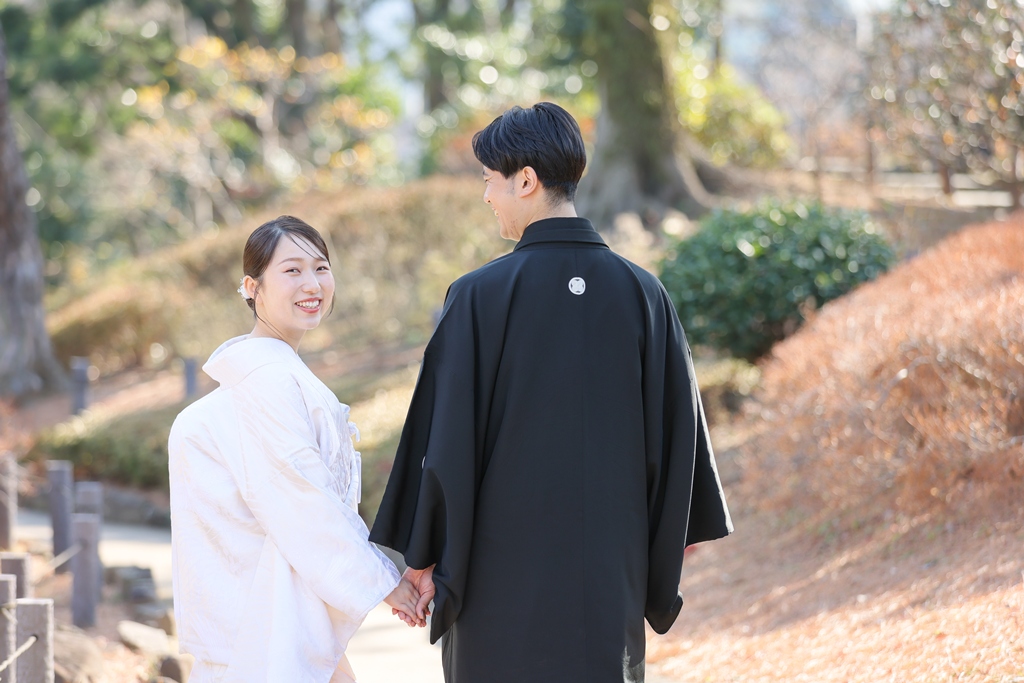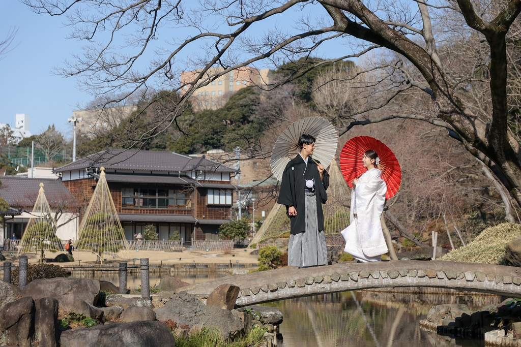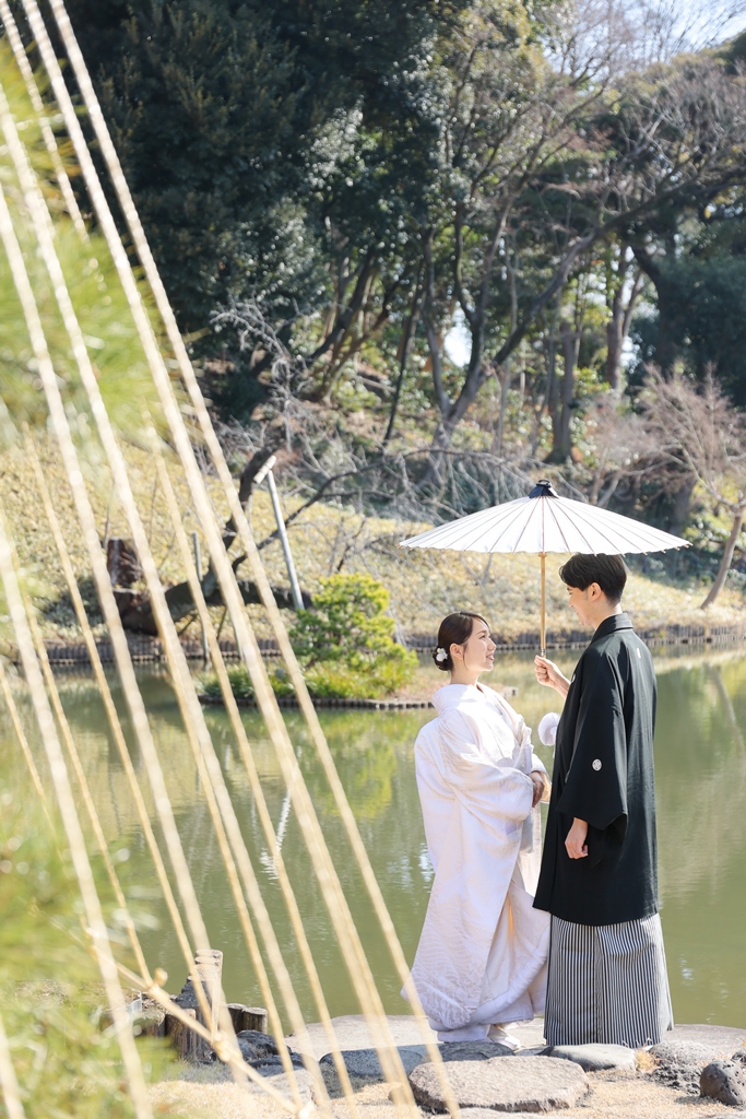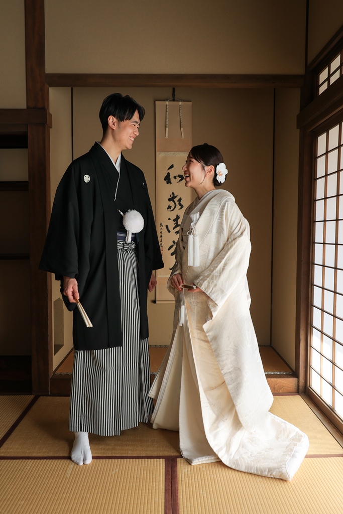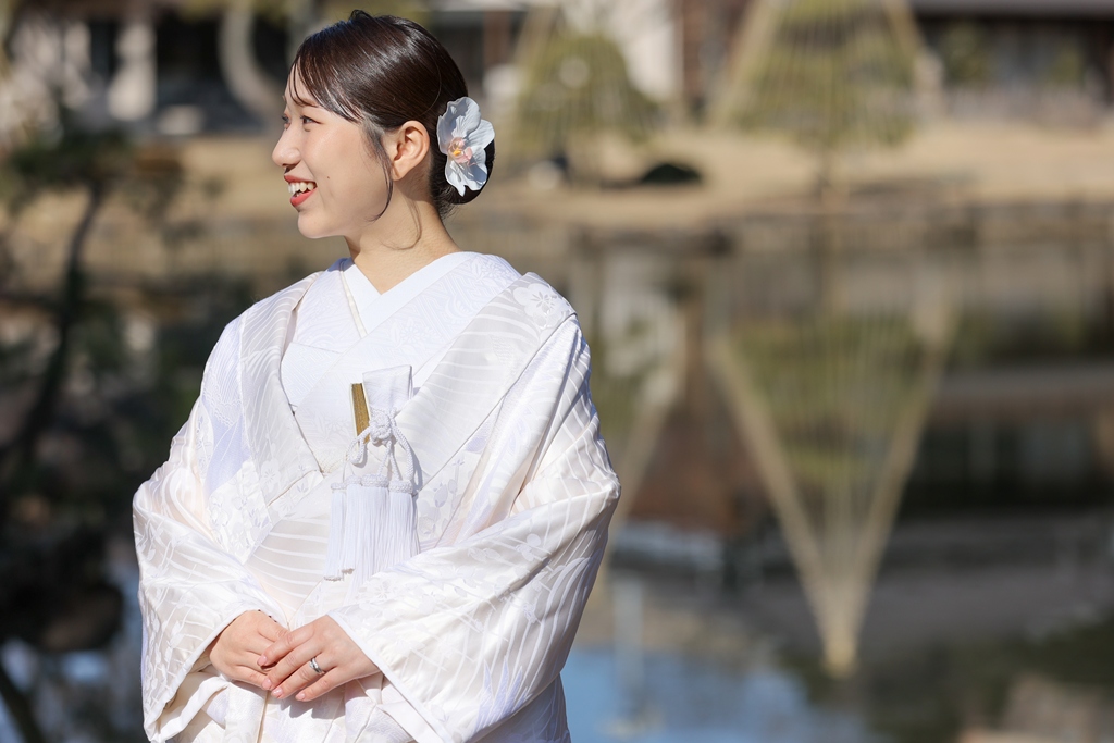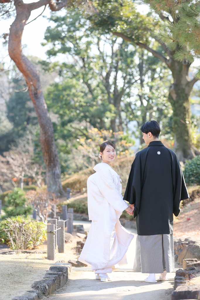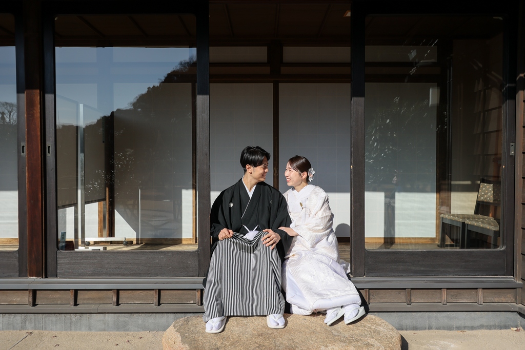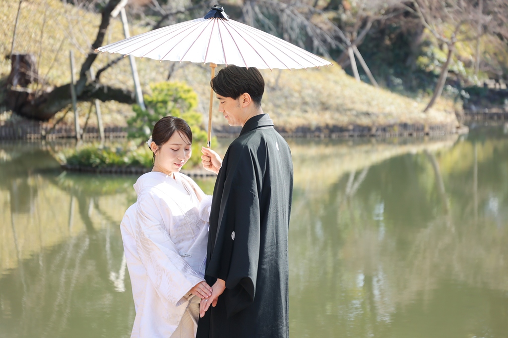 Thank you for choosing us for your beautiful kimono photoshoot at Higoso-Hosokawa Garden. The bride looked radiant in her vibrant iro uchikake and delicate hair ornaments – truly breathtaking. The groom looked so dashing in his montsuki hakama; together, you both perfectly embodied Japan’s beautiful traditions.