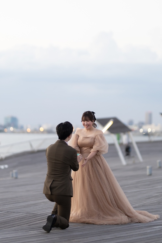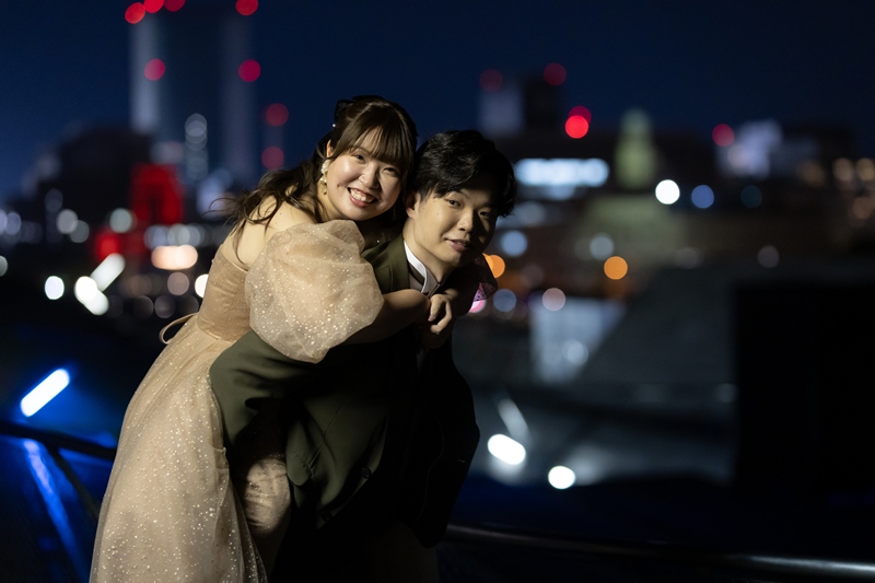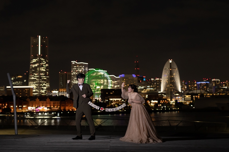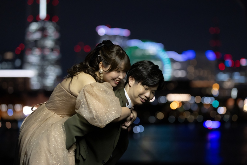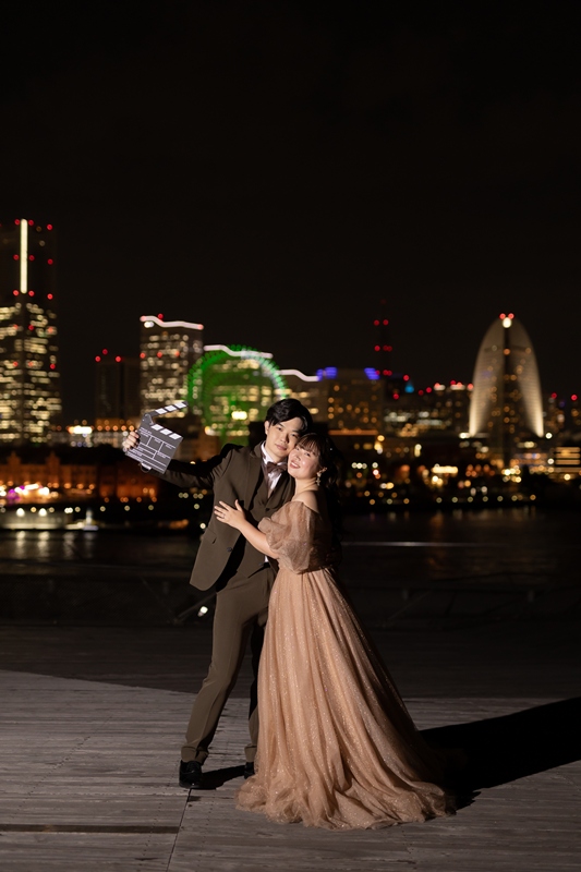 The beige-colored dress and khaki tuxedo were incredibly stylish and matched the beautiful scenery of Osanbashi perfectly. Your natural smiles and the joyful atmosphere made the whole experience fun for our team as well.