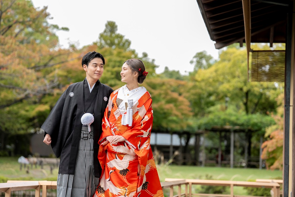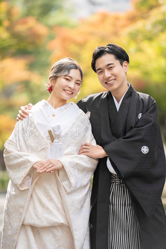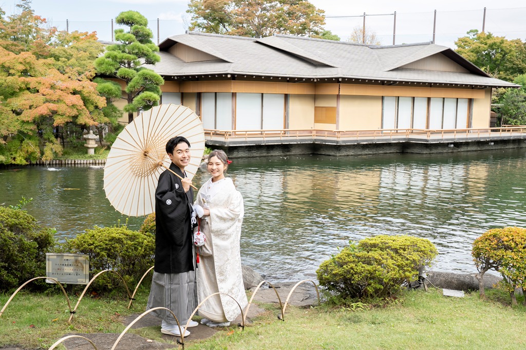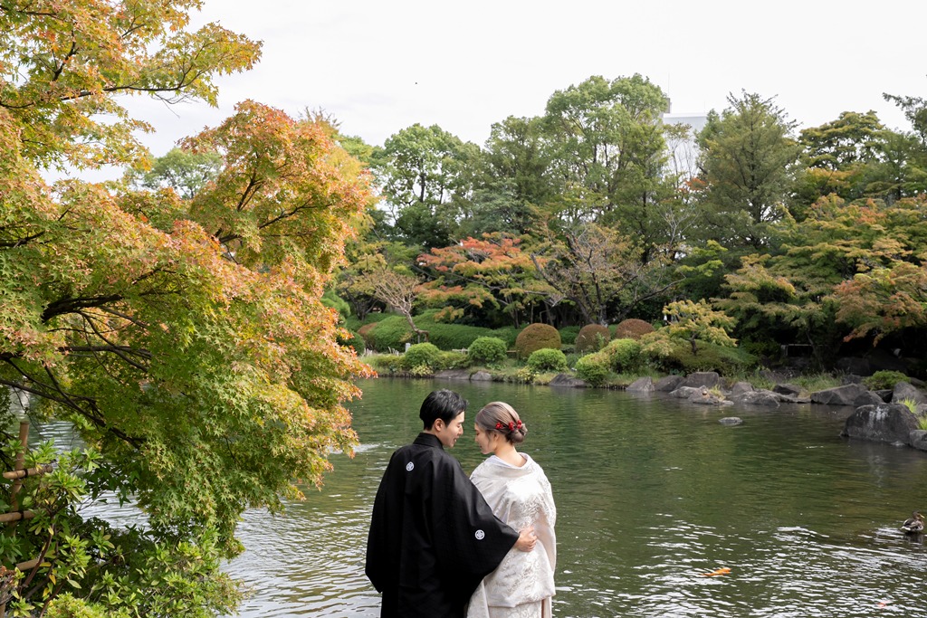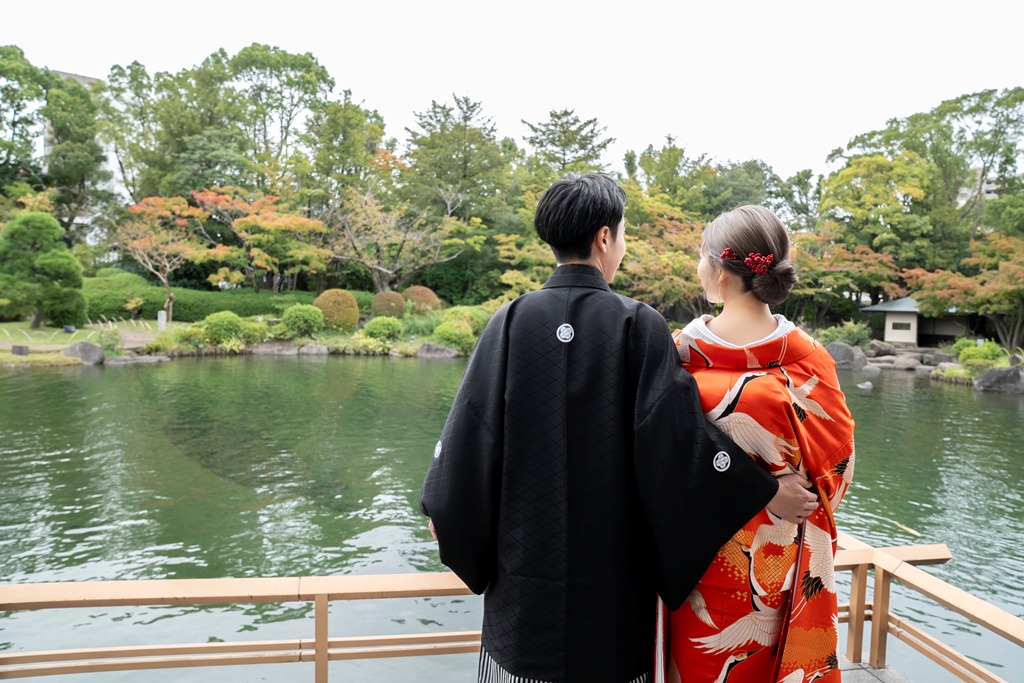 The tranquil waterside scenery and seasonal greenery of Heisei Garden create a perfect setting that beautifully enhances the elegance of traditional Japanese attire. It was a great honor for our team to photograph your stunning appearance in such a special location.On the day of the shoot, you both looked exceptionally graceful. The white wedding kimono and the colorful uchikake harmonized with the lush greenery and gentle sunlight, turning each moment into a beautifully memorable scene. The way you walked along the garden paths and the way you stood close together with the shimmering water behind you conveyed a sense of calm and a deep bond between you.