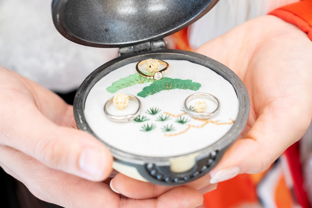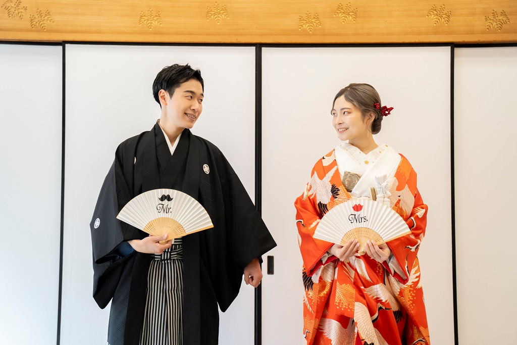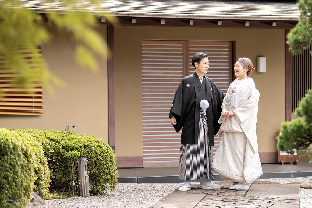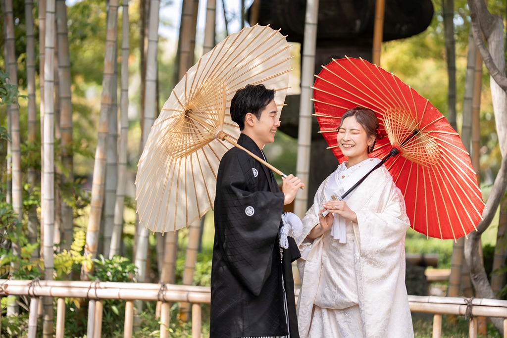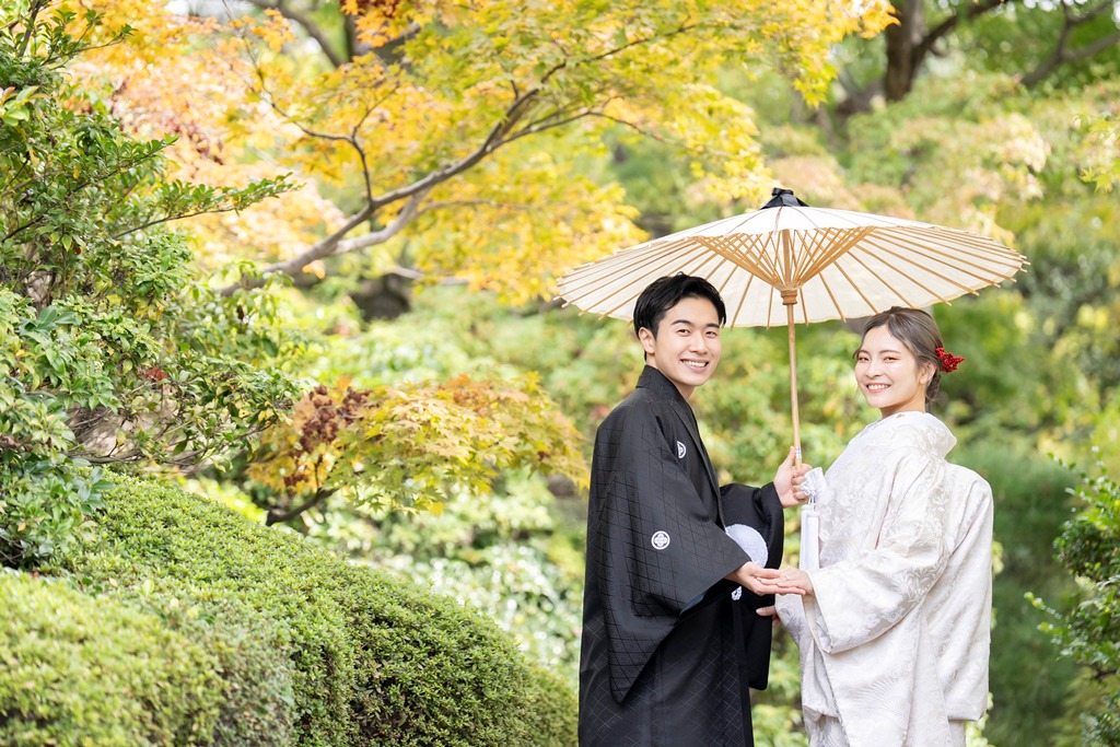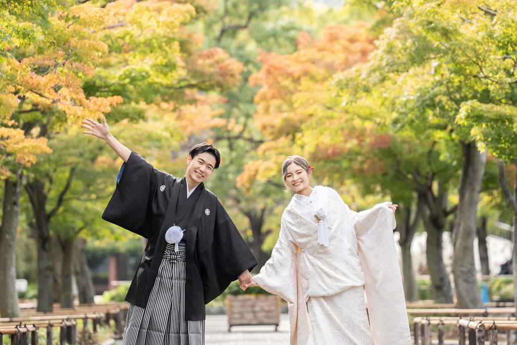 The tranquil waterside scenery and seasonal greenery of Heisei Garden create a perfect setting that beautifully enhances the elegance of traditional Japanese attire. It was a great honor for our team to photograph your stunning appearance in such a special location.On the day of the shoot, you both looked exceptionally graceful. The white wedding kimono and the colorful uchikake harmonized with the lush greenery and gentle sunlight, turning each moment into a beautifully memorable scene. The way you walked along the garden paths and the way you stood close together with the shimmering water behind you conveyed a sense of calm and a deep bond between you.