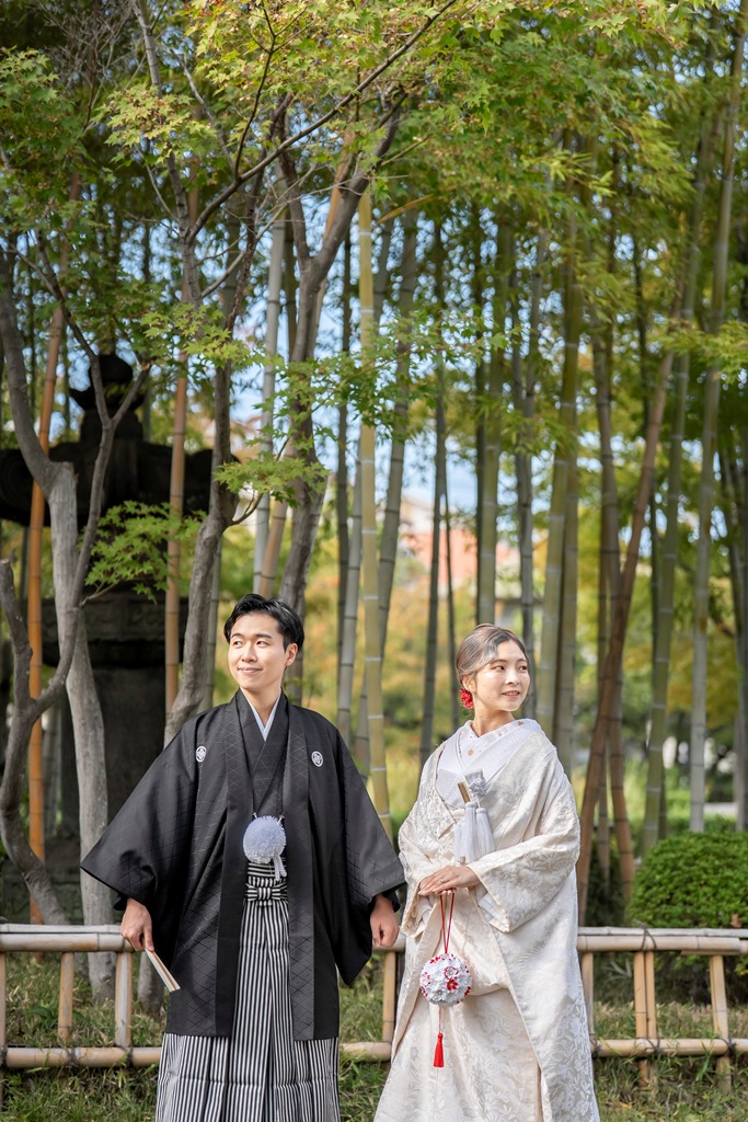 We have always loved Japanese gardens, and being able to photograph in a bamboo grove—which we initially hoped for—was a major deciding factor. Another appealing point was that we could capture the beautiful autumn foliage when we planned our shoot in late October. The indoor facilities also matched the aesthetic we envisioned. - FROM