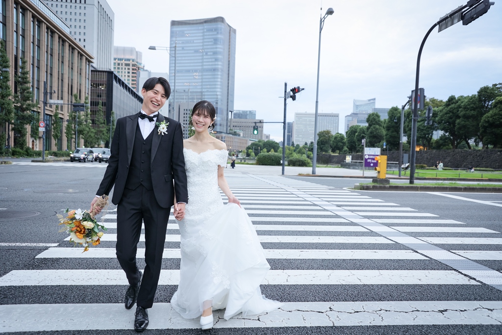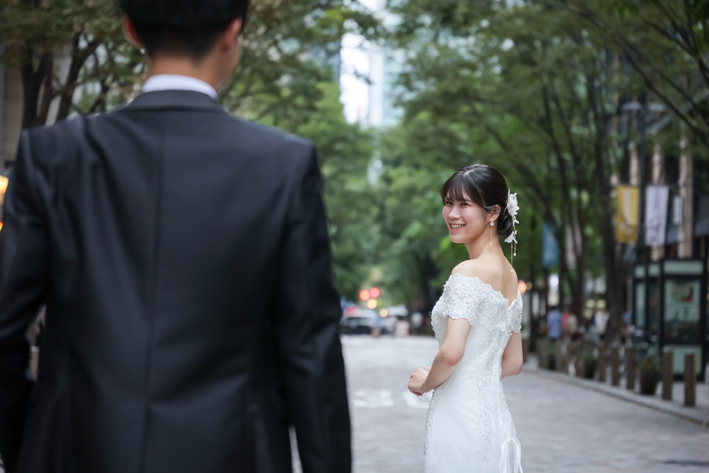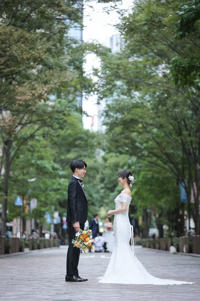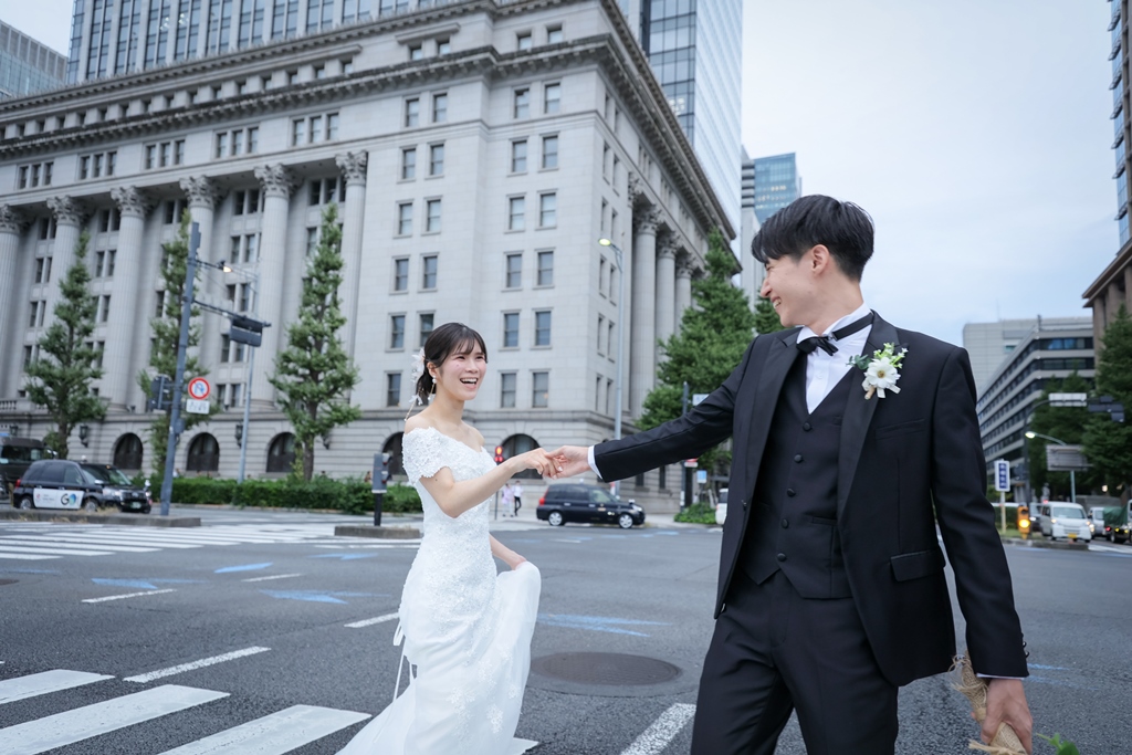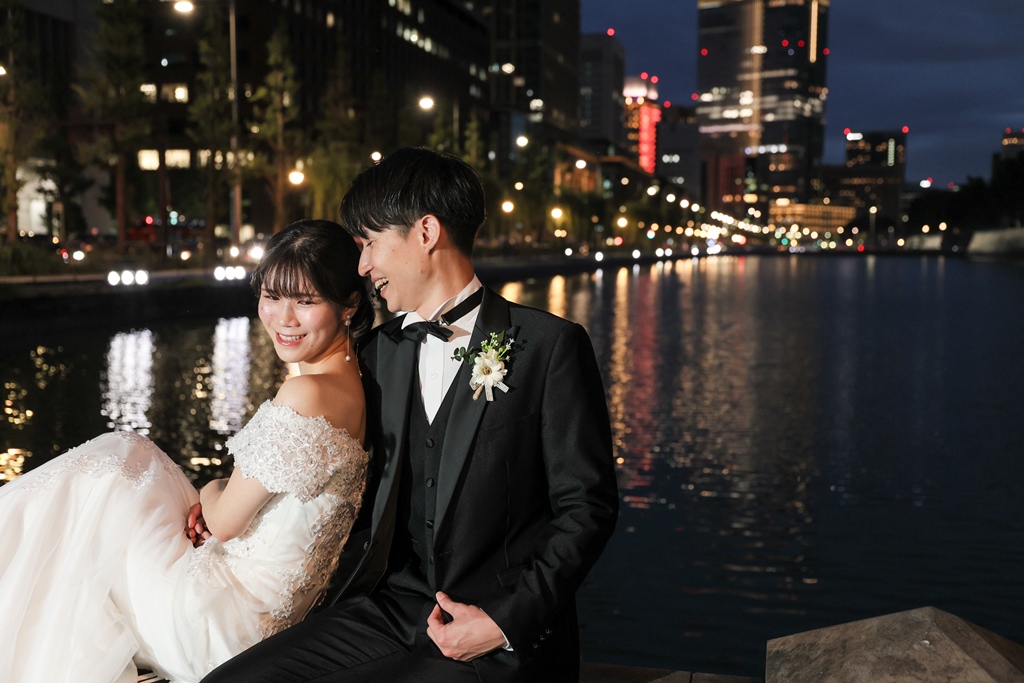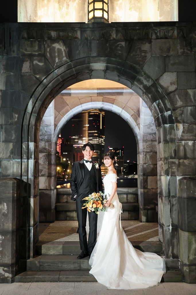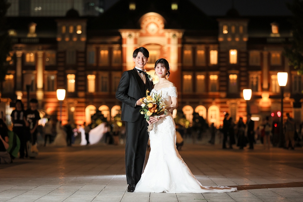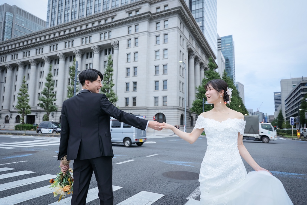 Your Western-style photoshoot at Tokyo Station—truly, great work and thank you for your effort!The silhouette of you two glowing amidst the Marunouchi nightscape was simply stunning. From the shot along the lush green-lined Naka-dori to the elegant atmosphere captured at Wadakura Gate, we were able to bring various concepts to life.