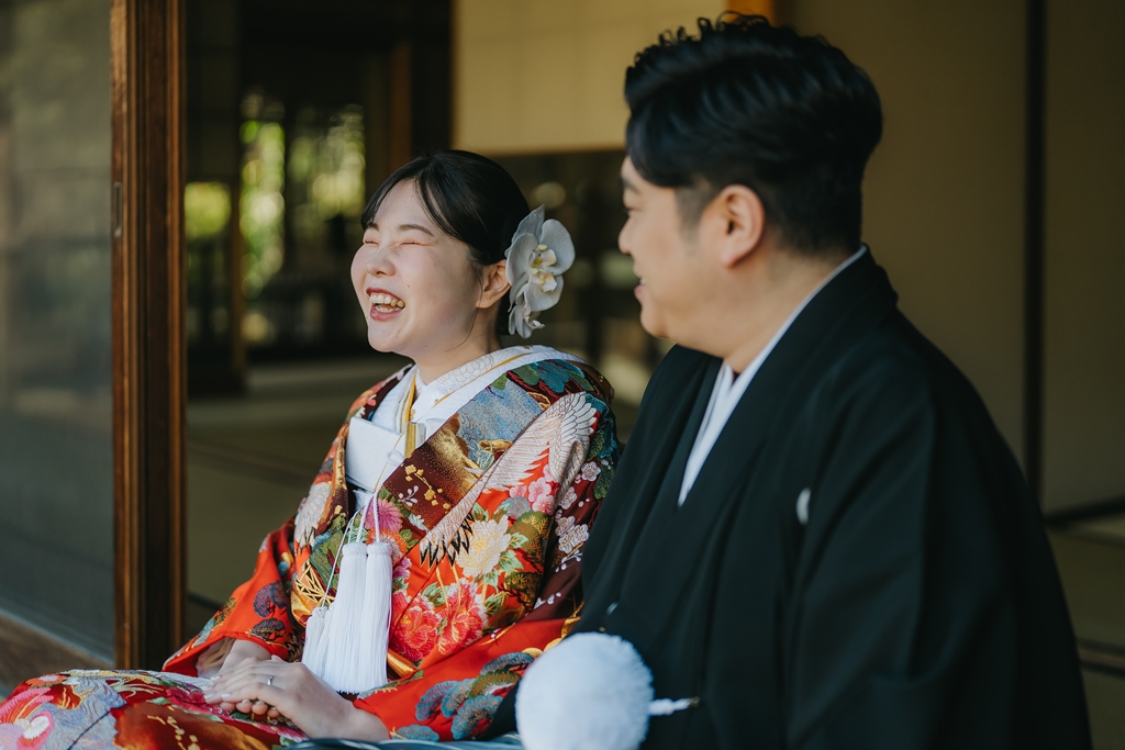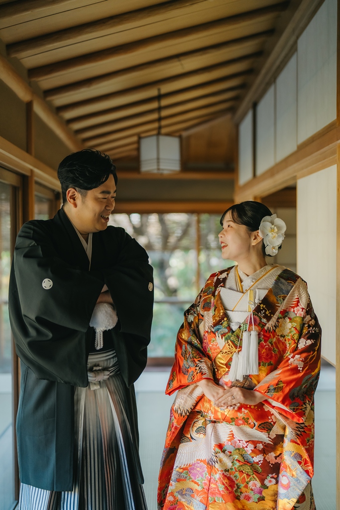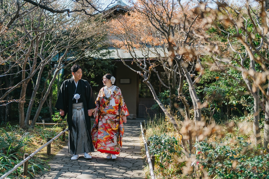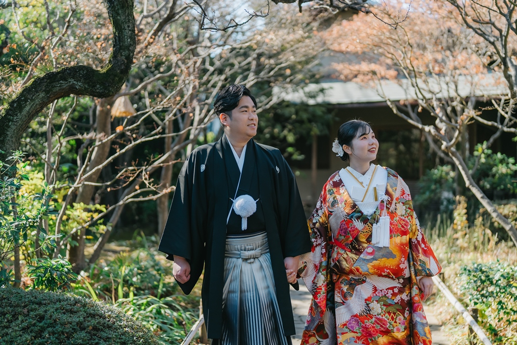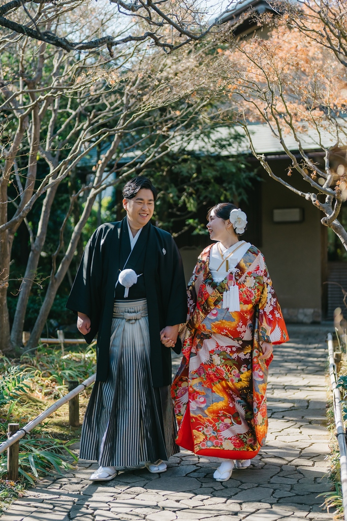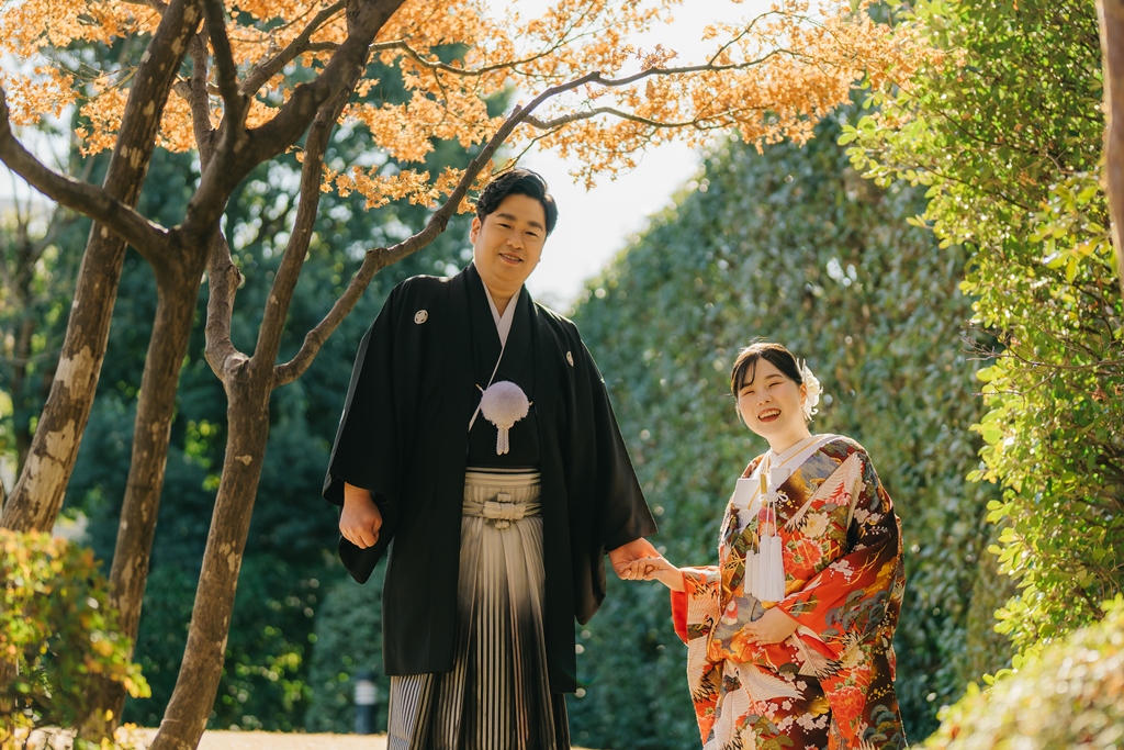 The bride’s kimono, with its elegant hues and vibrant patterns, was truly exquisite and harmonized perfectly with her gentle smile. The groom looked so dignified in his hakama; together, you both resembled a scene from a beautiful Japanese painting. The serene Japanese garden scenery of Mejiro Garden beautifully enhanced your traditional attire, and the changing seasons gracefully colored your special moments.