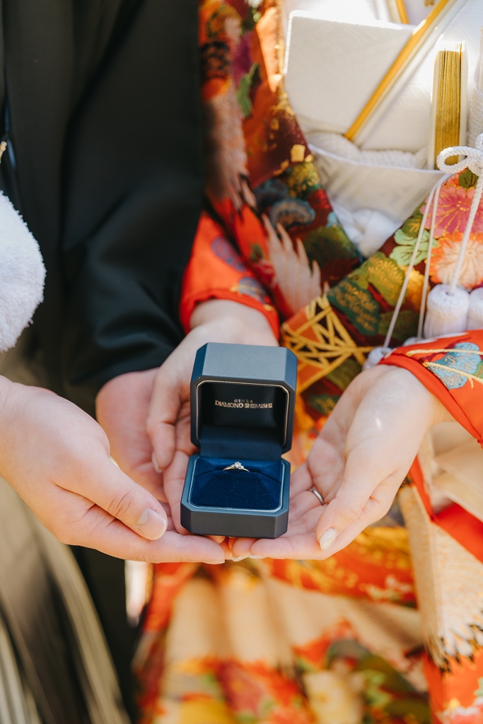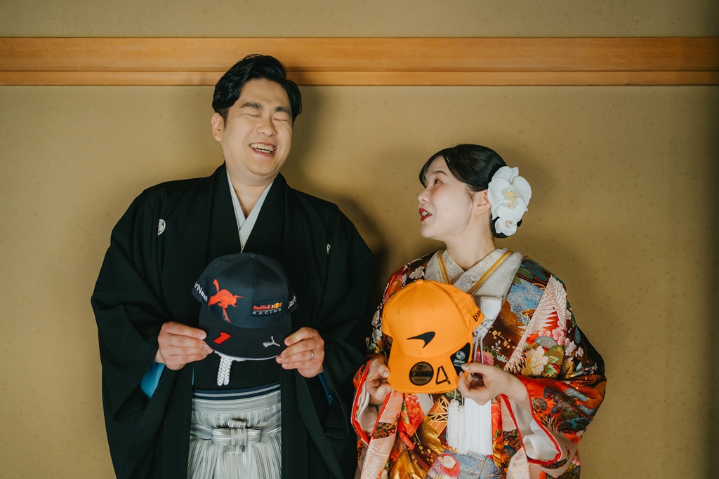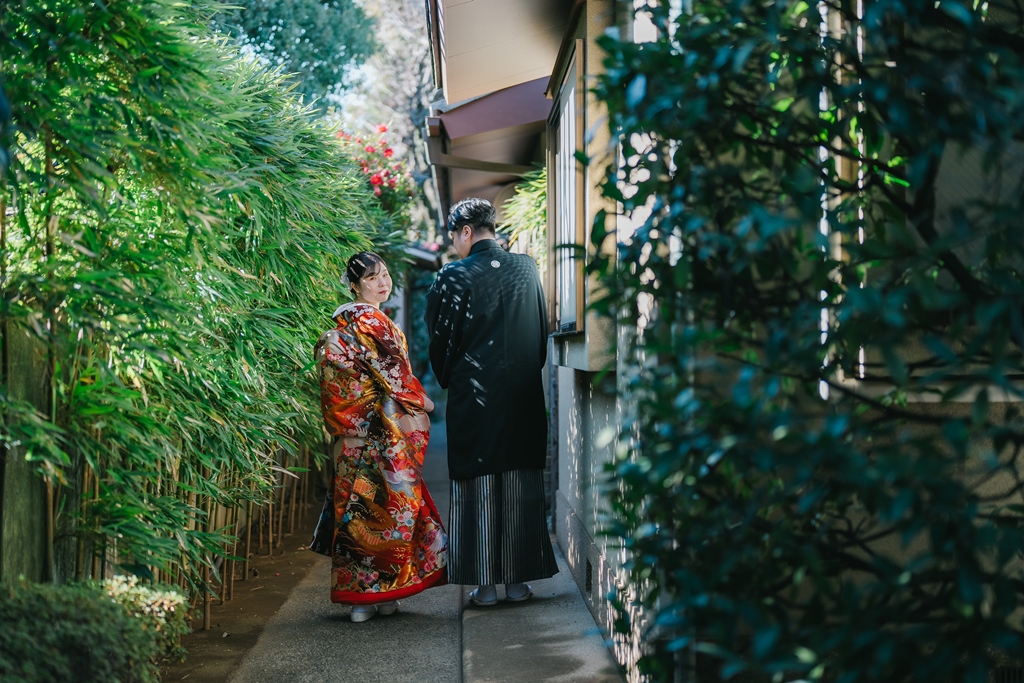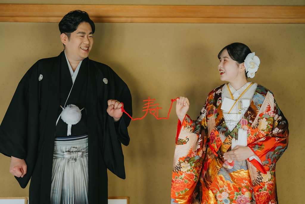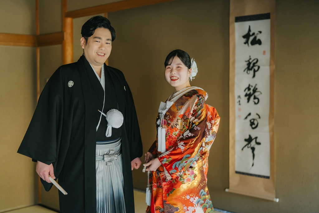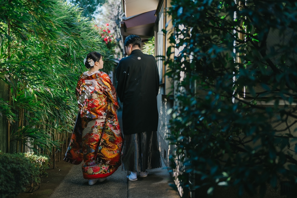 The bride’s kimono, with its elegant hues and vibrant patterns, was truly exquisite and harmonized perfectly with her gentle smile. The groom looked so dignified in his hakama; together, you both resembled a scene from a beautiful Japanese painting. The serene Japanese garden scenery of Mejiro Garden beautifully enhanced your traditional attire, and the changing seasons gracefully colored your special moments.