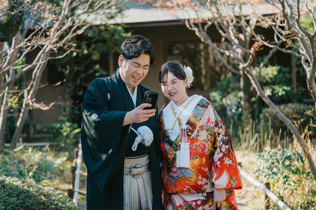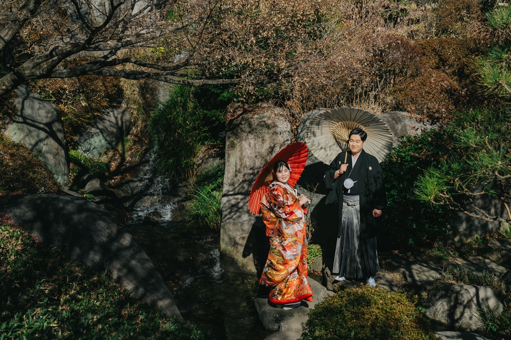 - The atmosphere of the Japanese-style room at Mejiro Garden, the photoshoot location, was wonderful. I also appreciated being able to take photos in various spots throughout the garden. Even though it was winter, there were areas with greenery, and they even captured some photos that looked like autumn, which was great. The photographer made excellent use of the props I brought for both the traditional Japanese and Western-style outfits, which made the photoshoot a lot of fun.
