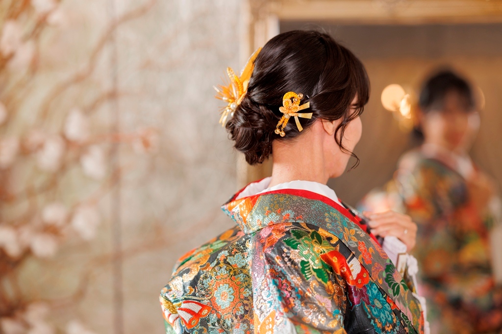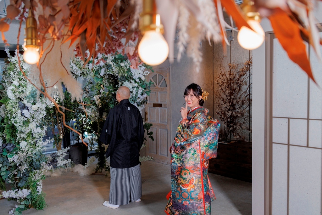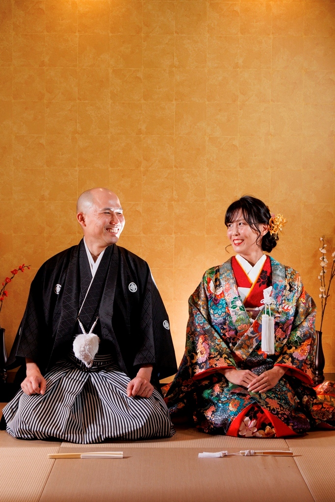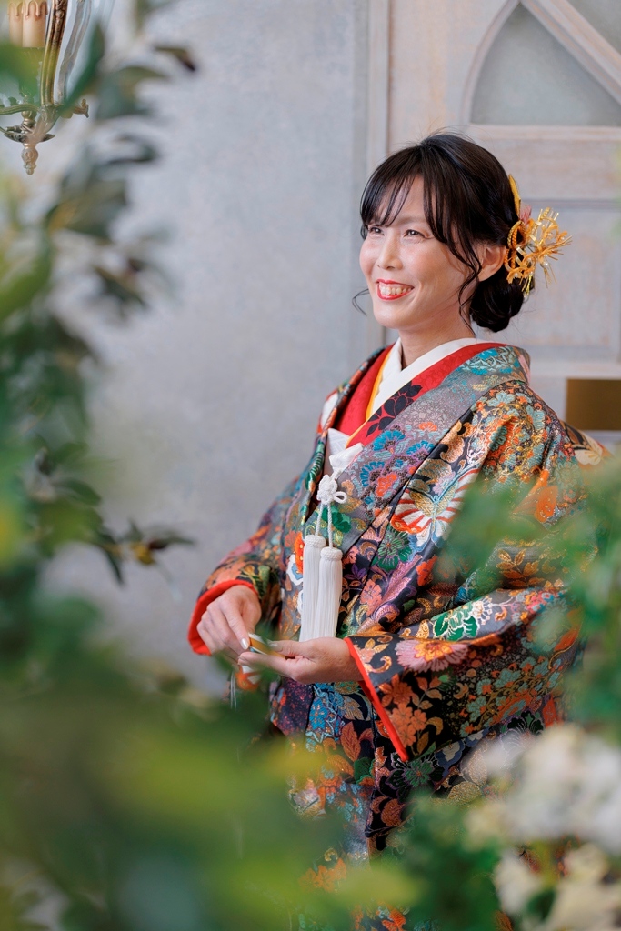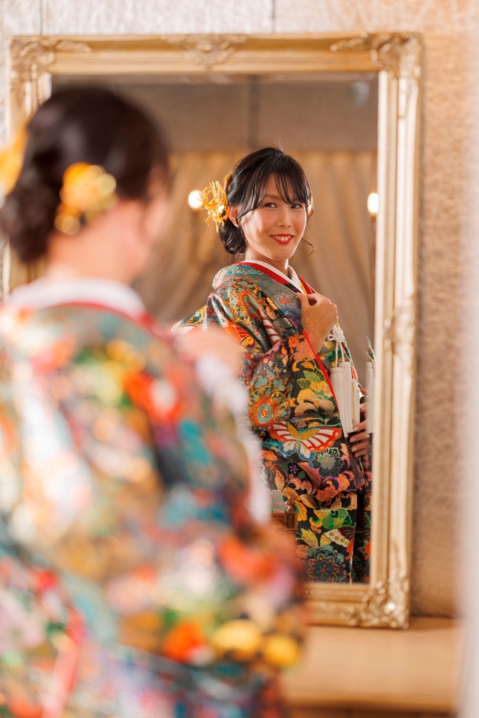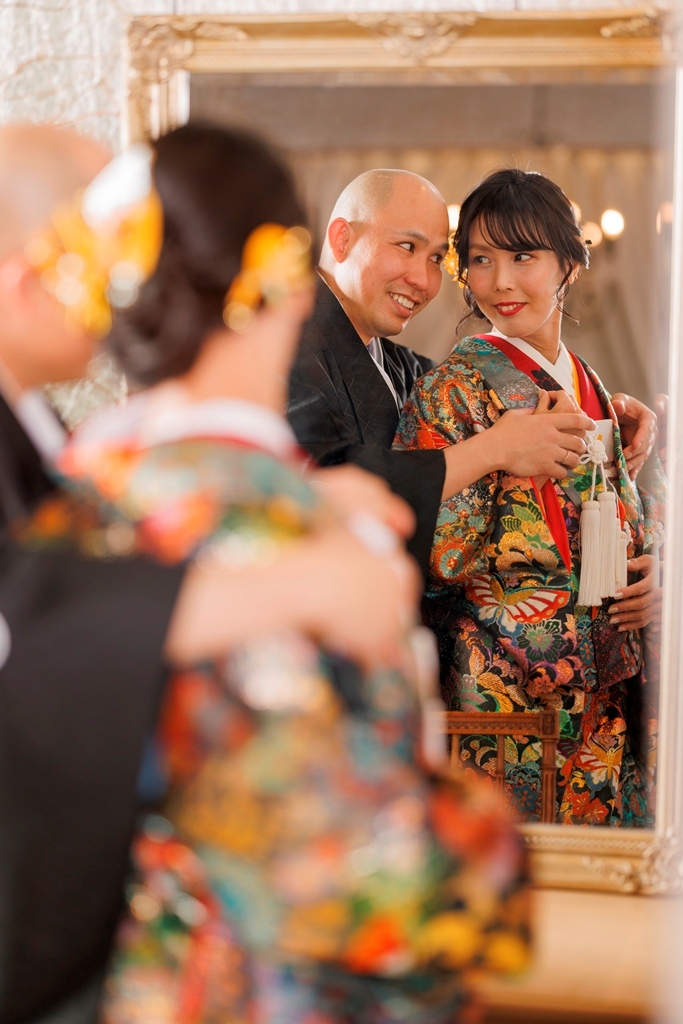 The brightly colored colored Uchikake and the red color of the kimono undergarment are very gorgeous and suit the bride well ☺.