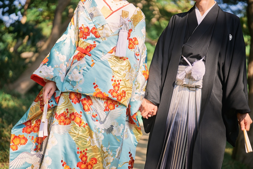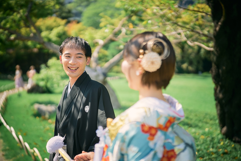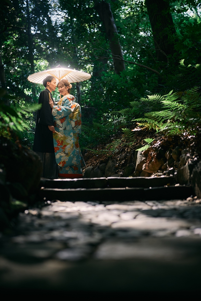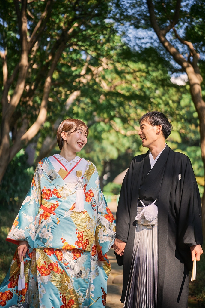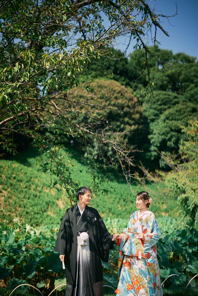 Your soft glances, natural smiles, and the way you held each other’s hands harmonized with the tranquil atmosphere, creating a timeless story captured in both photos and video.The pure white of the shiromuku and the vibrant colors of the iro-uchikake blended beautifully with the garden’s greenery and seasonal colors, making every single shot breathtaking.