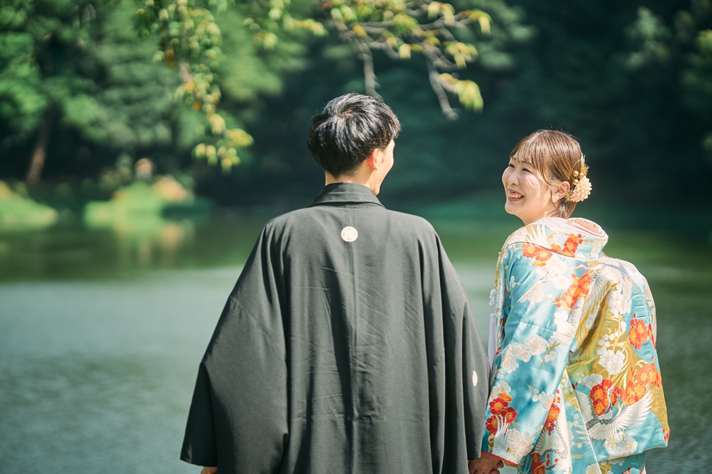 Amid the serene beauty of Koishikawa Korakuen, surrounded by lush greenery and the gentle ripple of water, your presence in kimono created a moment that felt as if time had stopped. Every time you shared a natural smile, our hearts were moved, and we were proud to share this special day with you.The red-painted bridge, moss-covered stone paths, and the reflections of trees and sky in the pond all enhanced the elegance and subtlety of your kimono, making each moment look like a painting.