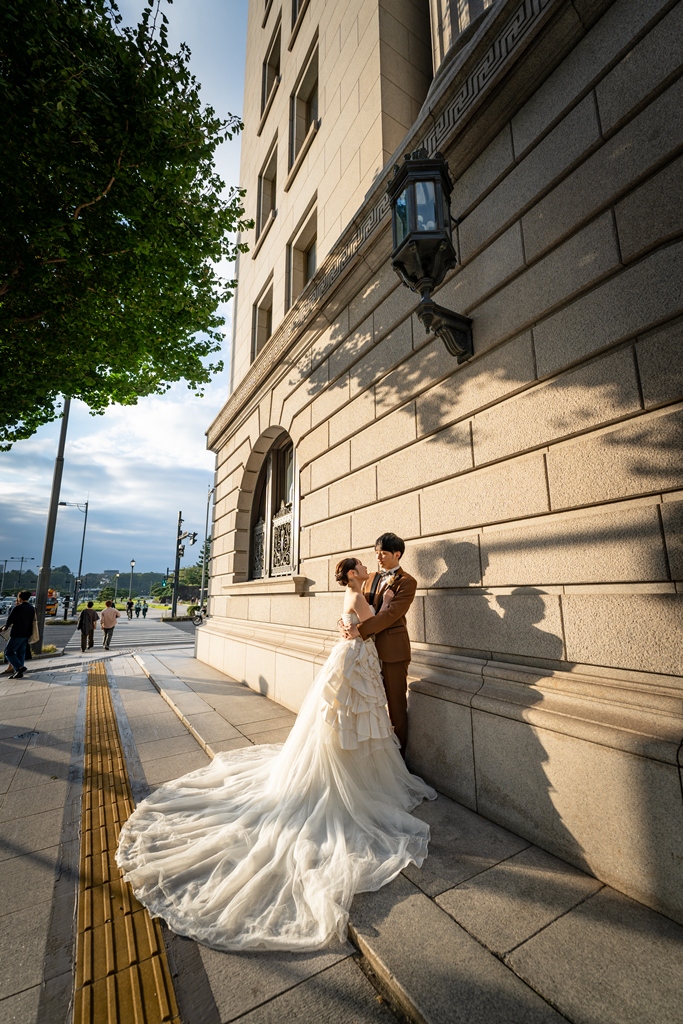 The sight of you walking hand in hand in front of the station harmonized beautifully with the grand cityscape and your elegant wedding style, making you shine just like the protagonists of a movie.Whether it was the soft, warm glow of twilight or the romantic moment when the city lights began to illuminate the night, every scene held a “special story” that belonged only to the two of you.