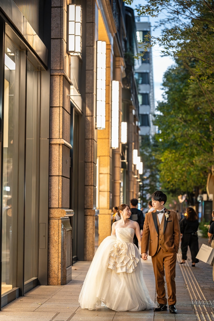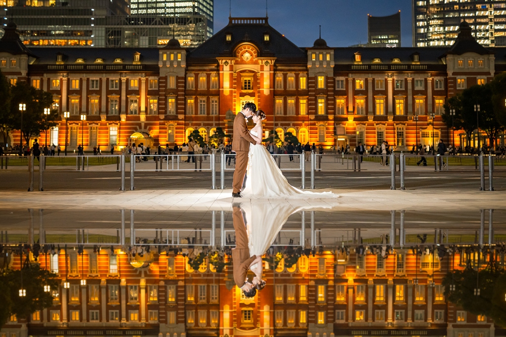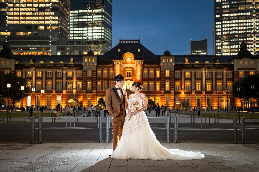 Tokyo Station is known for its iconic wedding photos, and we wanted to capture images we could treasure for a lifetime. The beautiful night scenery and the way the station lights up in the evening also made us feel, “We must shoot here.”