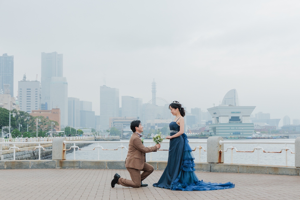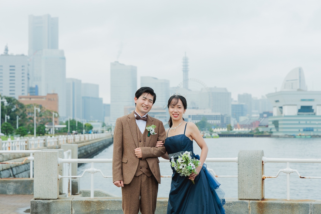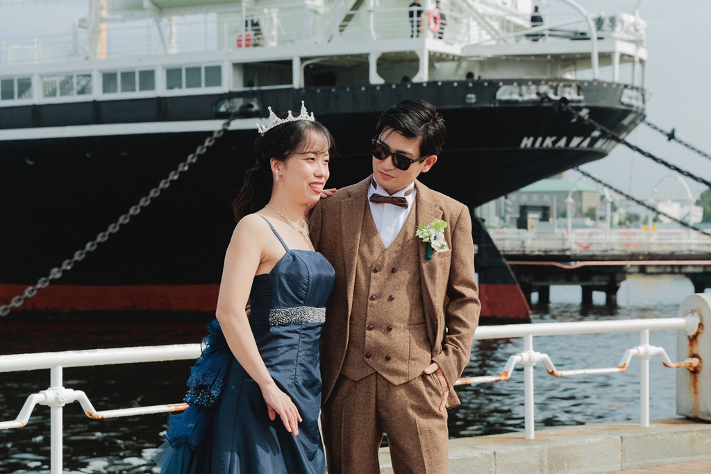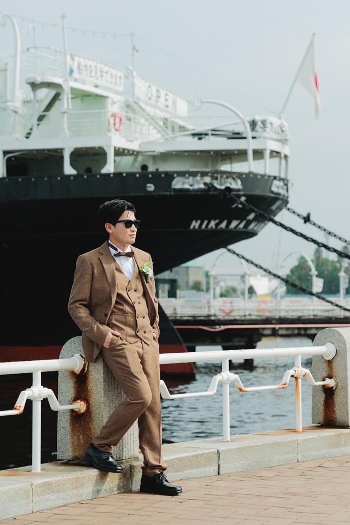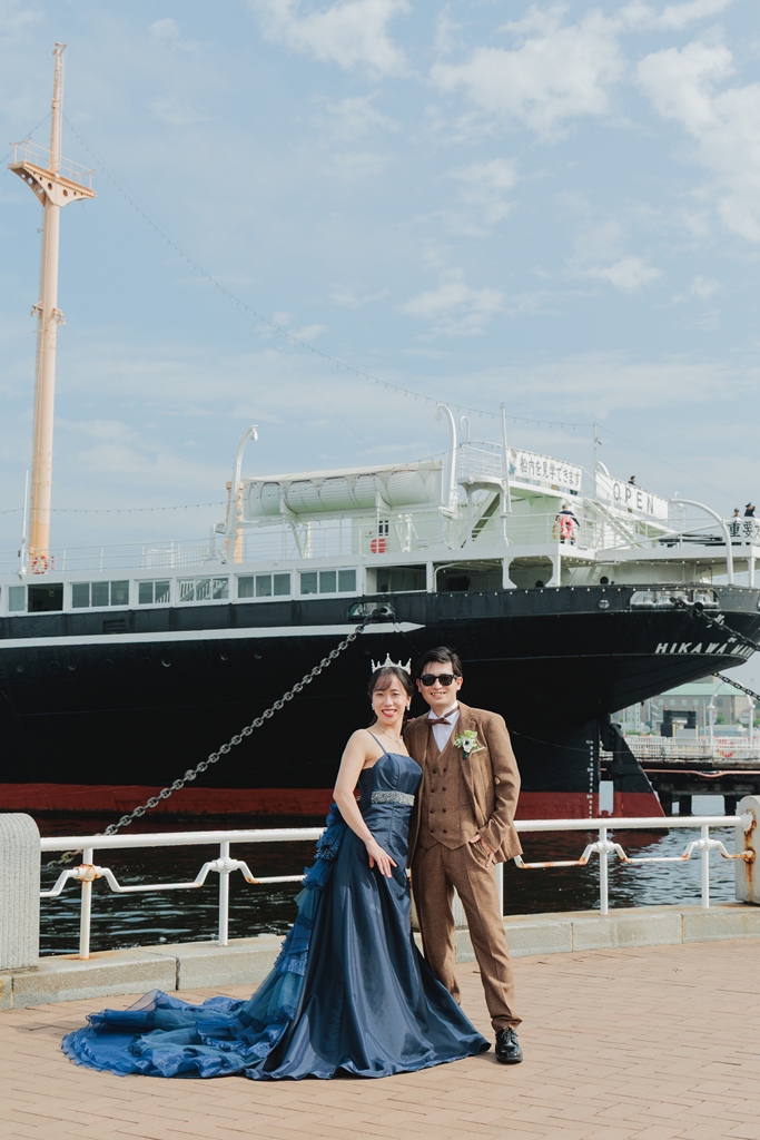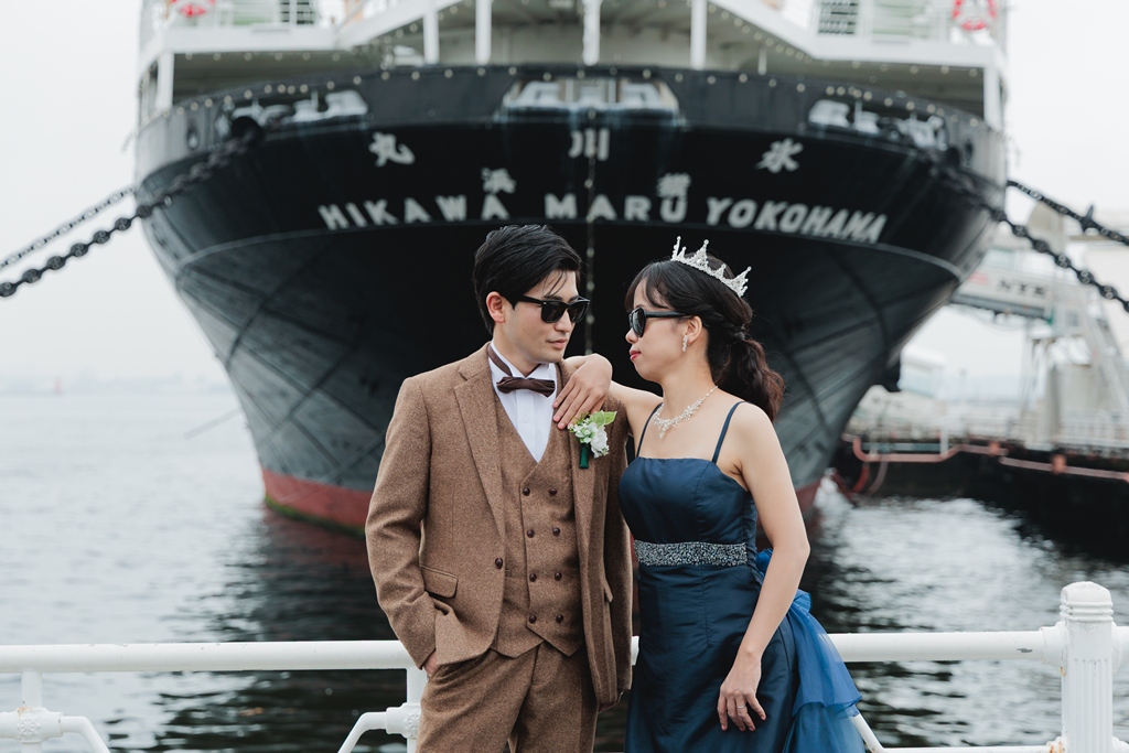 For the Western-style shoot, we chose Yamashita Park because my husband loves the show Abunai Deka, and I wanted to incorporate something he loves into our photos as well. - FROM