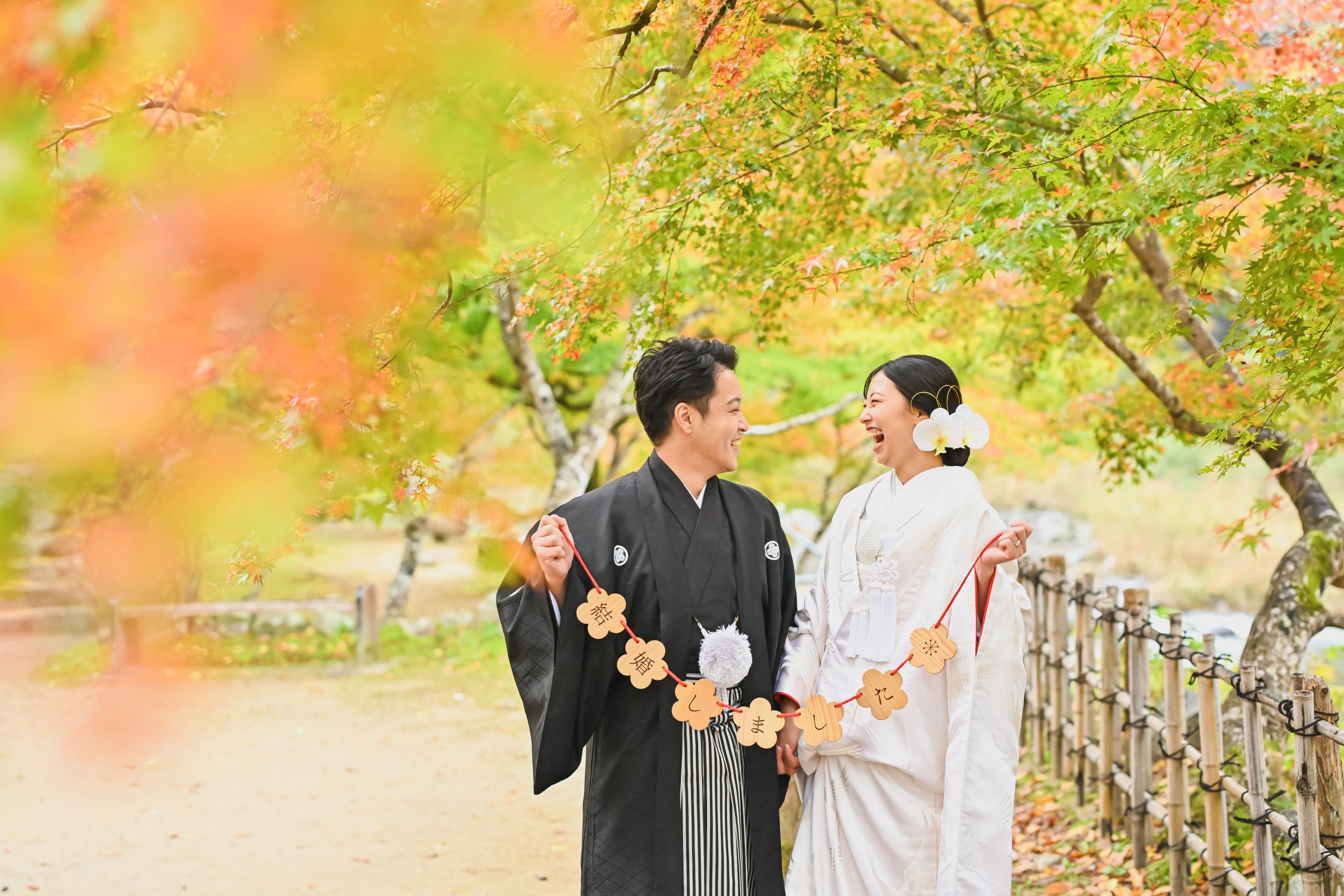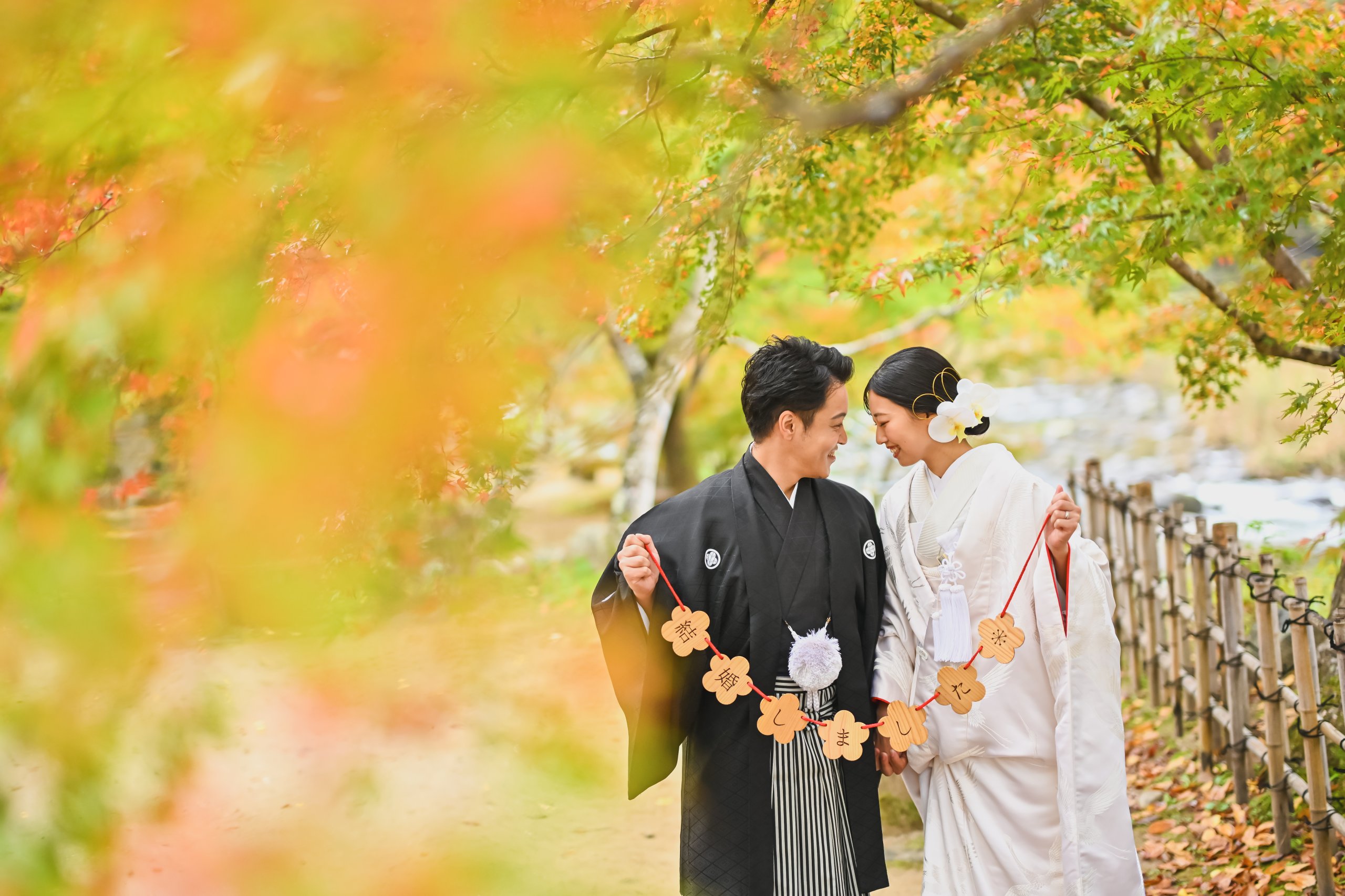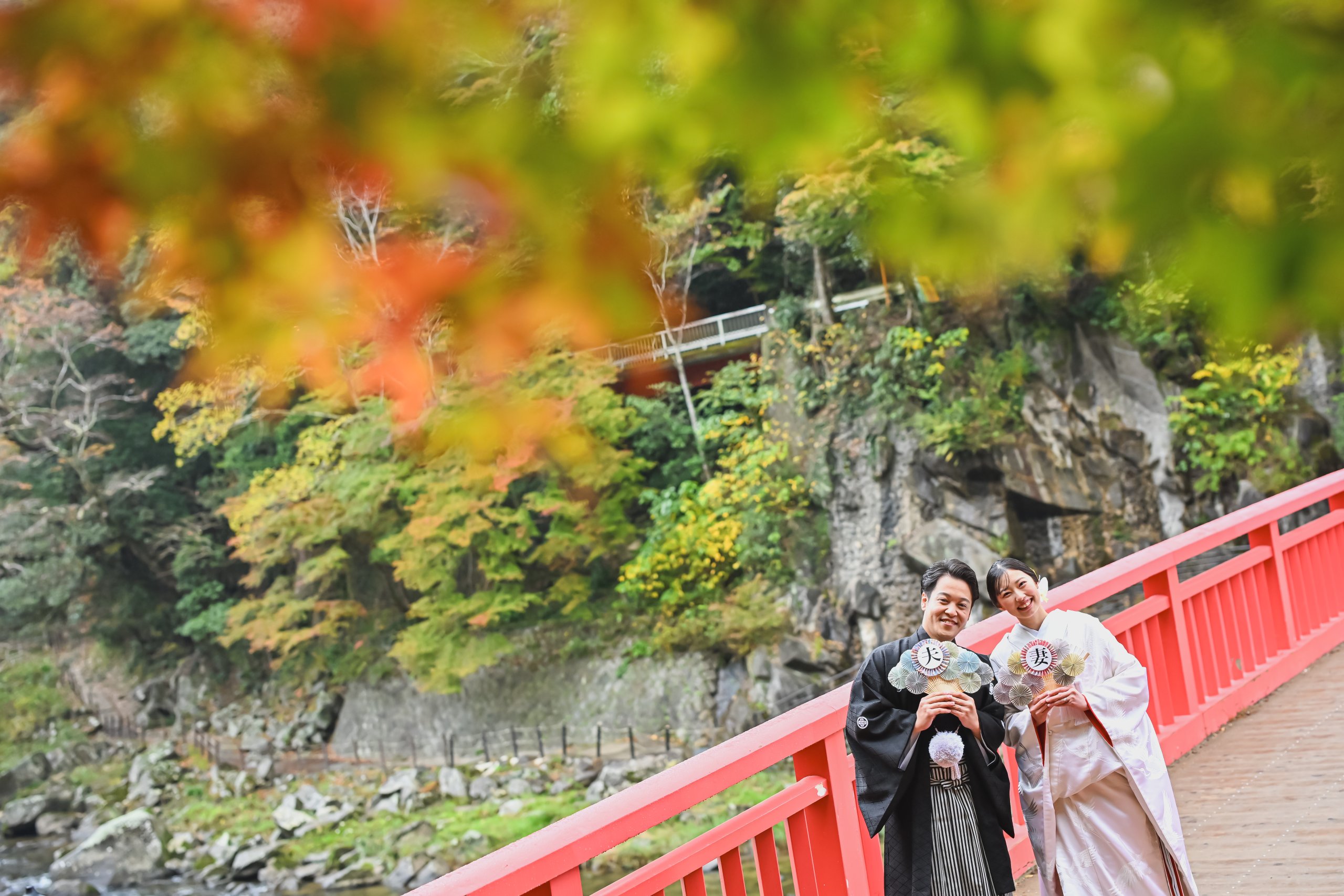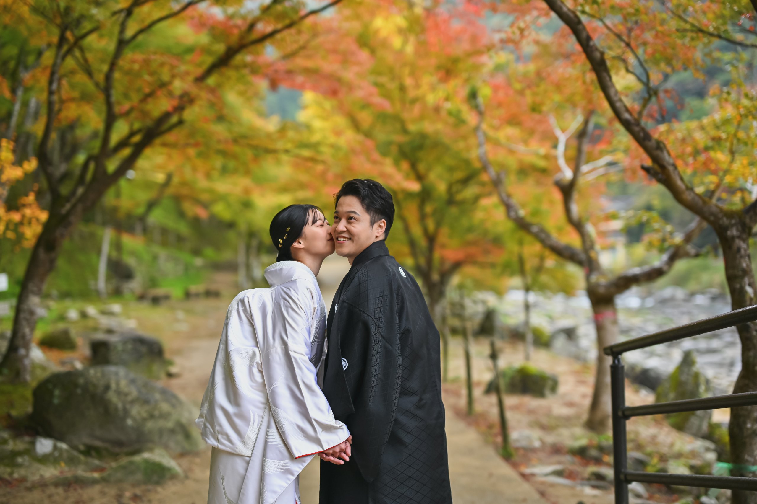 - We wanted to have a kimono pre-shoot at Korankei, a famous sightseeing spot for autumn foliage in Toyota City, and after searching around, we contacted THE SKY WEDDING because we found on the Internet and YouTube that there was a precedent of a pre-shoot at Korankei. After a phone meeting, I was able to get a concrete idea of what we were looking for and an image of what the shoot would look like on the day of the wedding, so we decided to request them to take the photos.