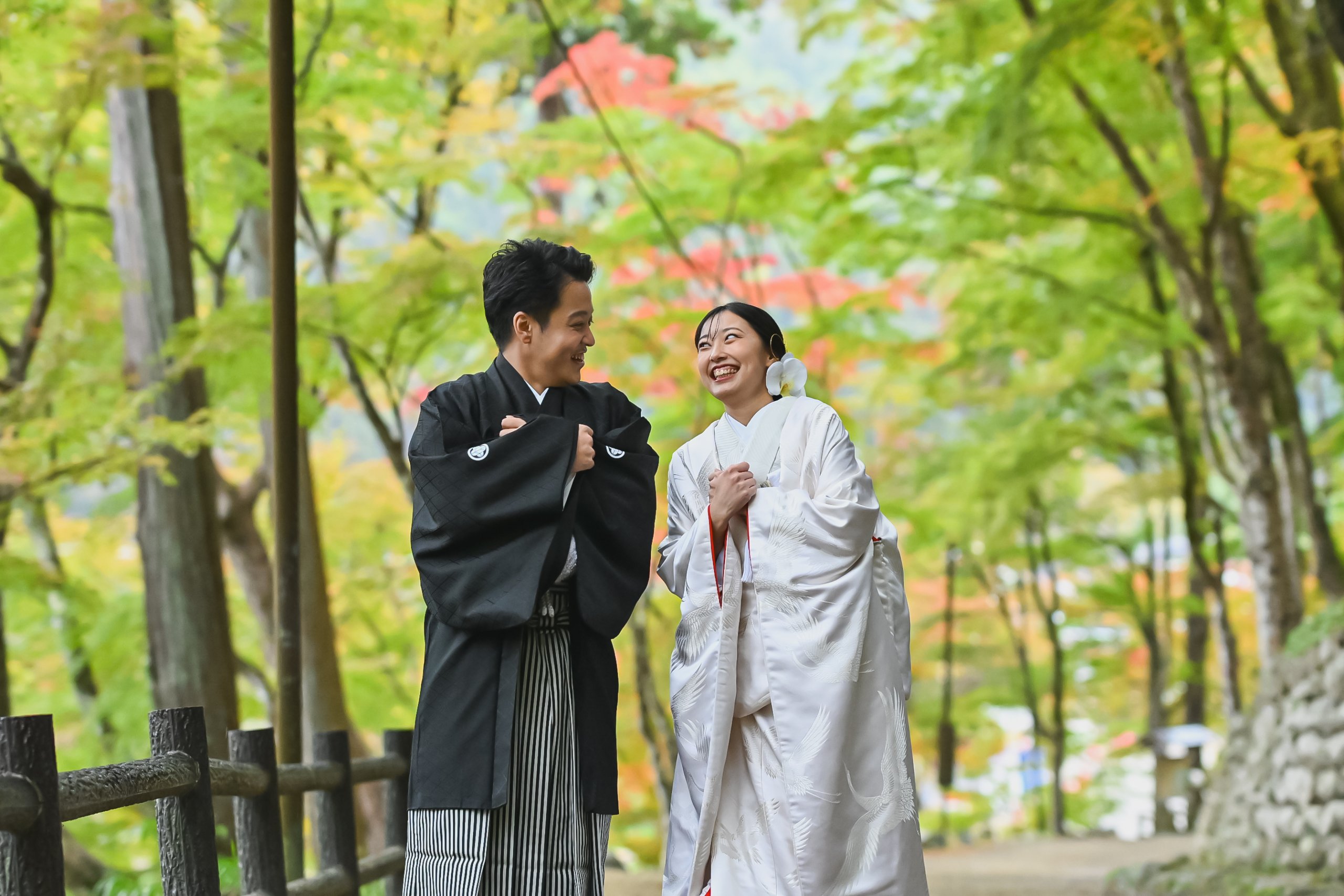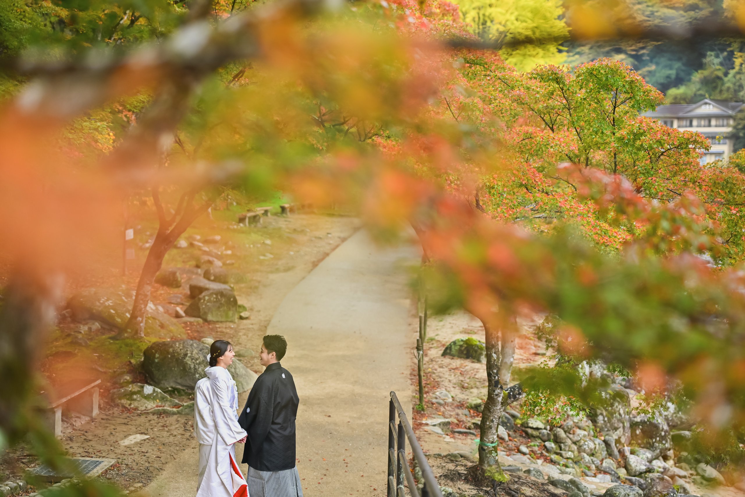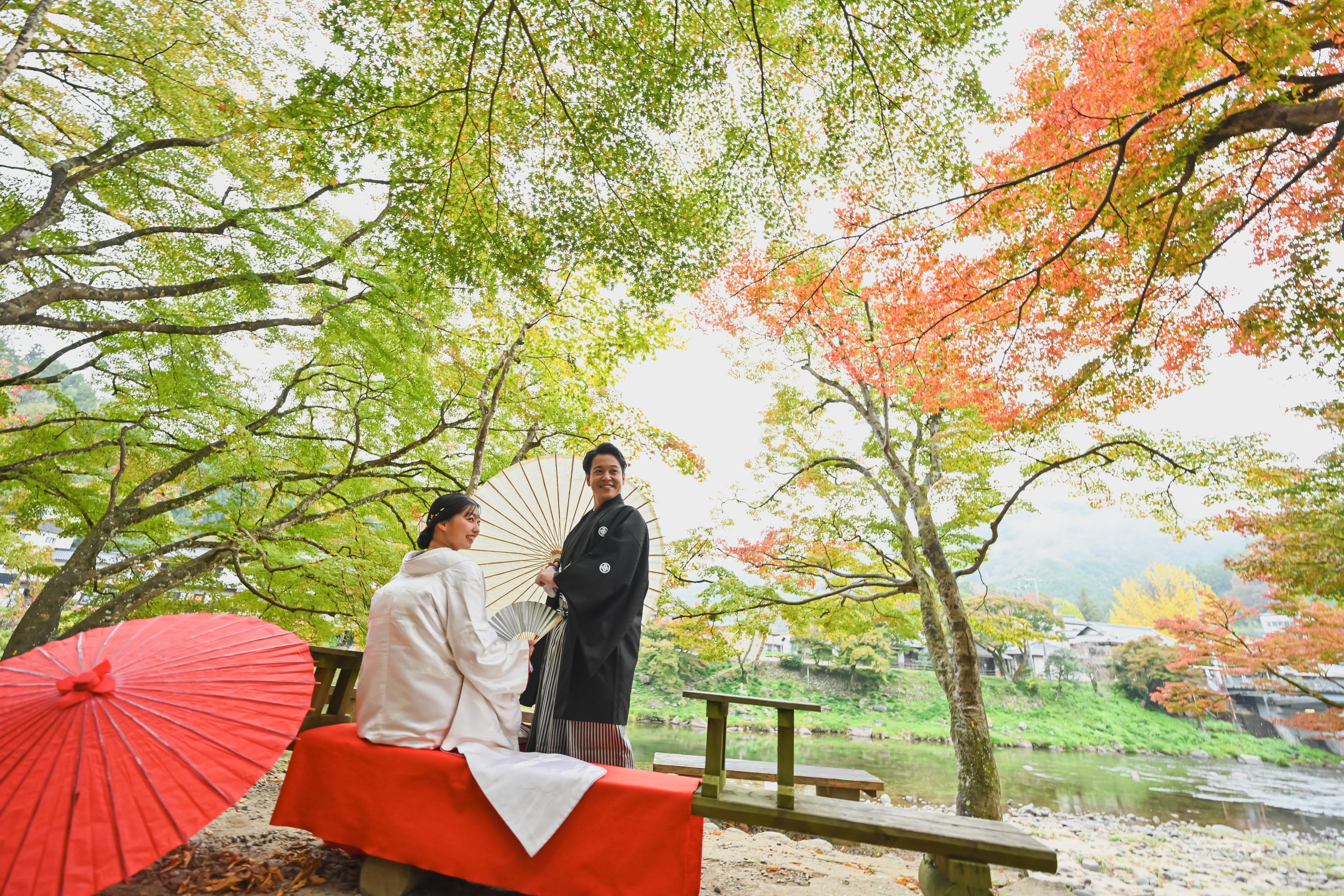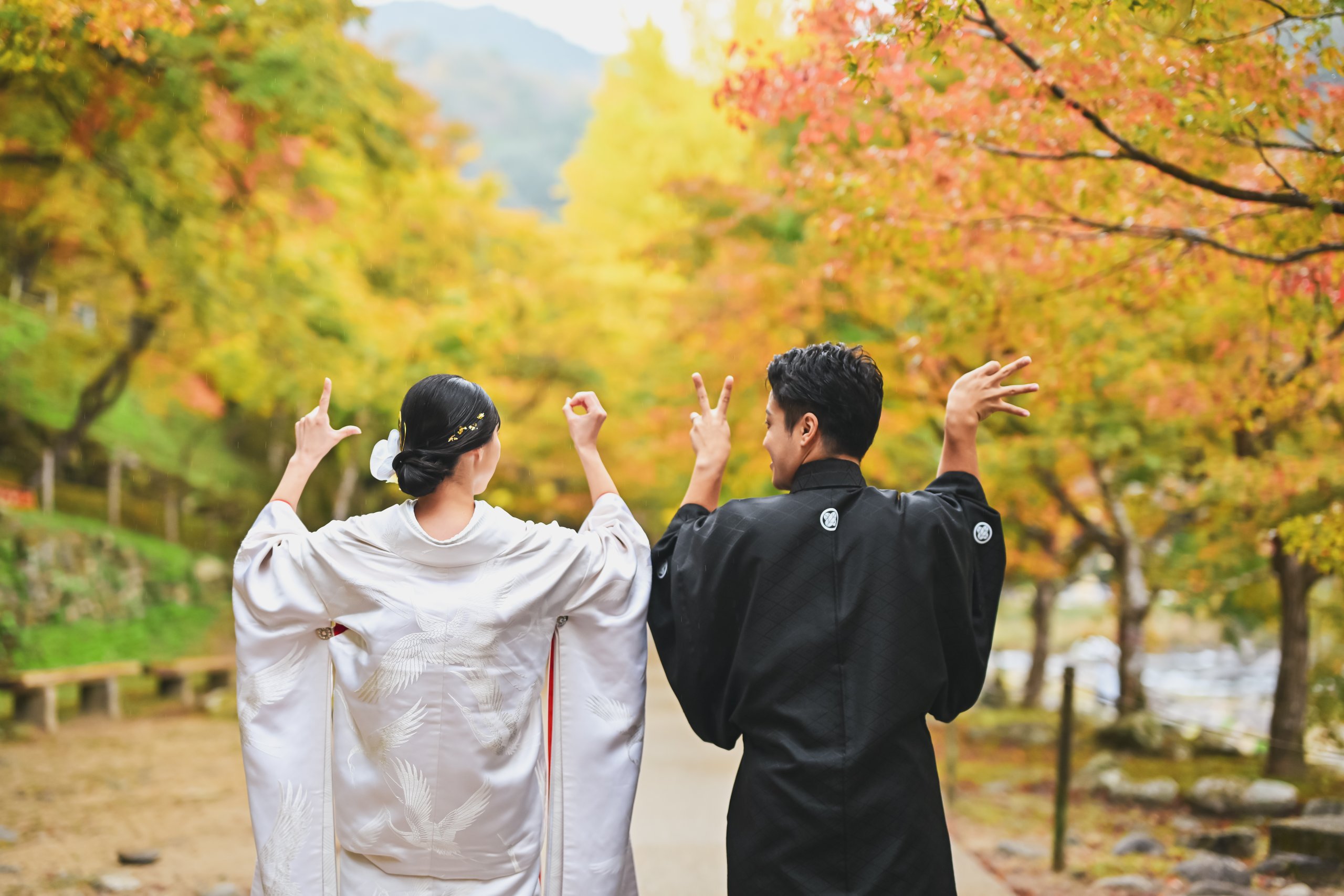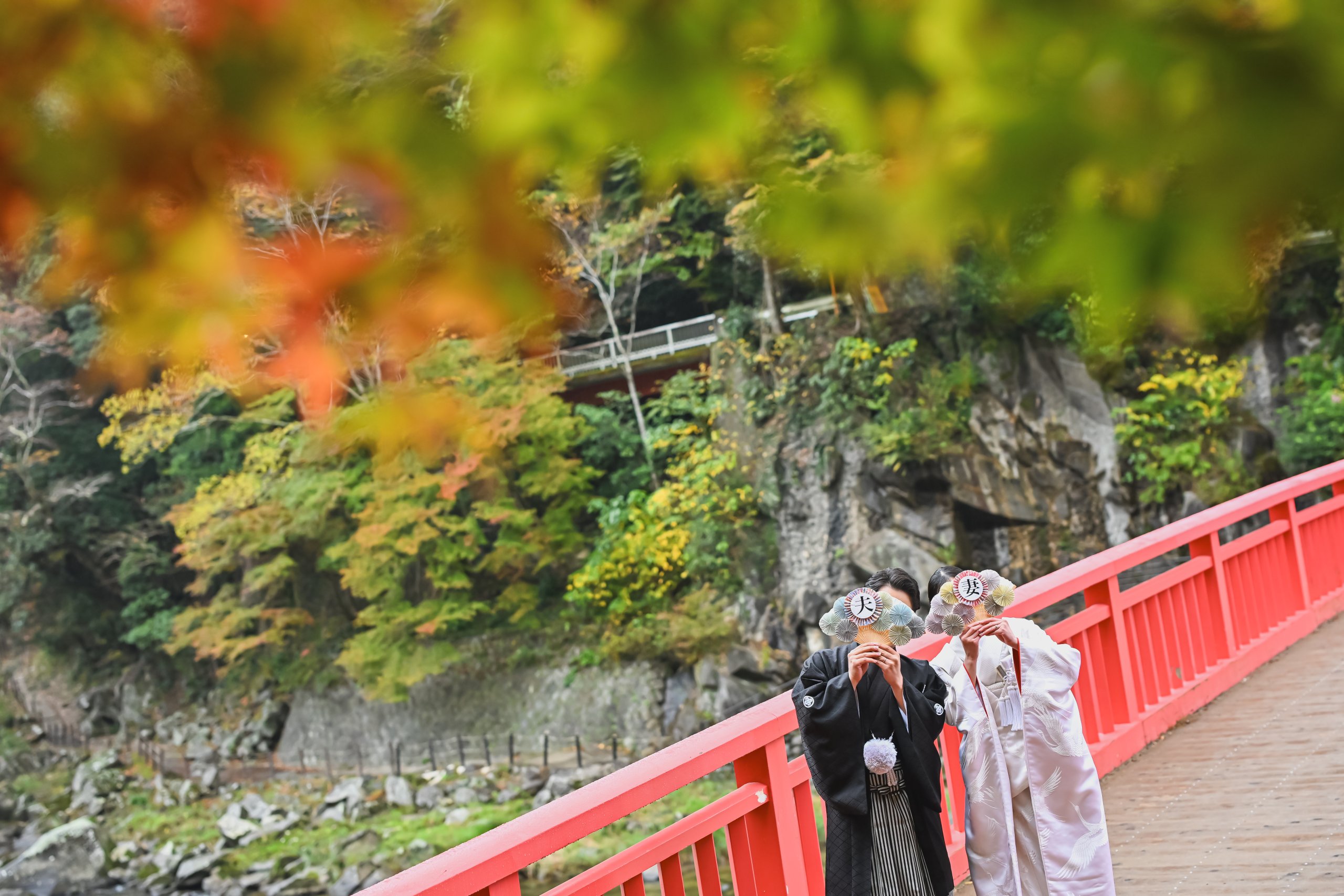 - We wanted to have a kimono pre-shoot at Korankei, a famous sightseeing spot for autumn foliage in Toyota City, and after searching around, we contacted THE SKY WEDDING because we found on the Internet and YouTube that there was a precedent of a pre-shoot at Korankei. After a phone meeting, I was able to get a concrete idea of what we were looking for and an image of what the shoot would look like on the day of the wedding, so we decided to request them to take the photos.