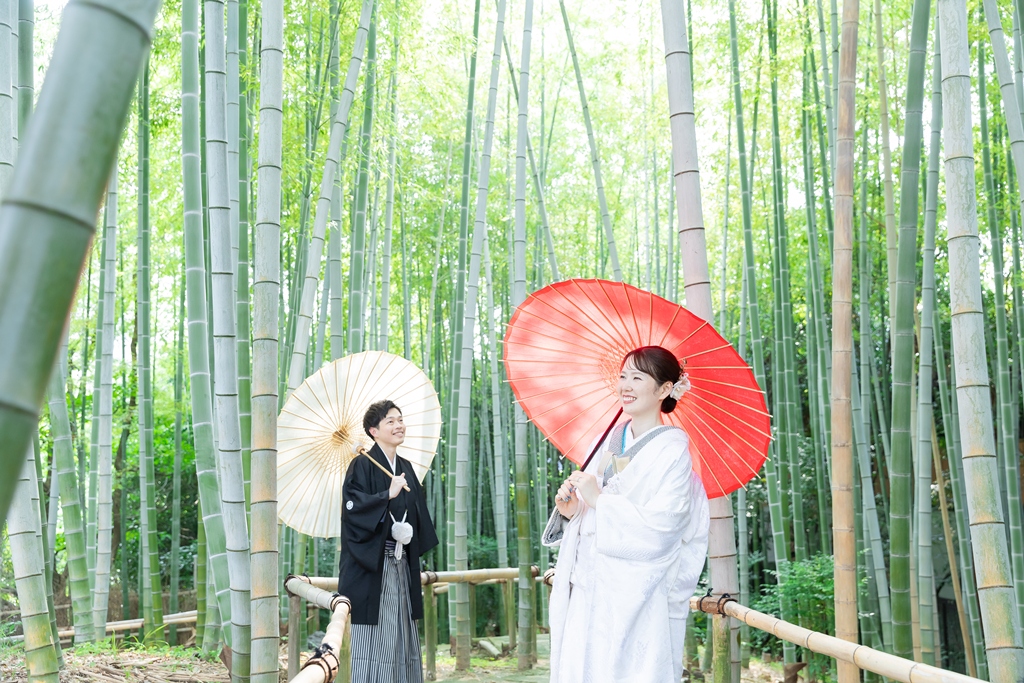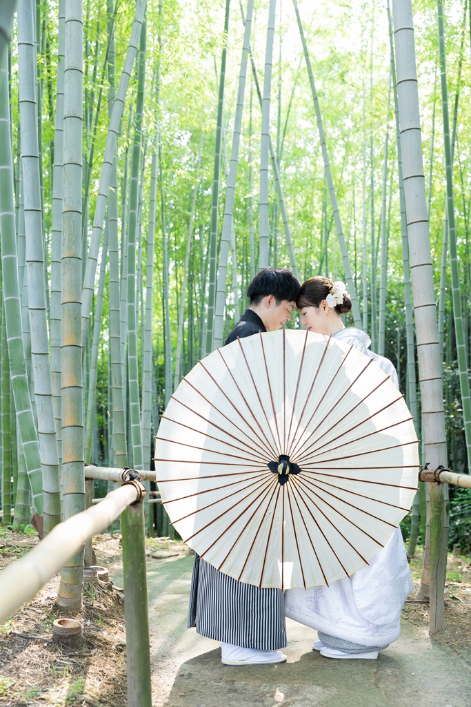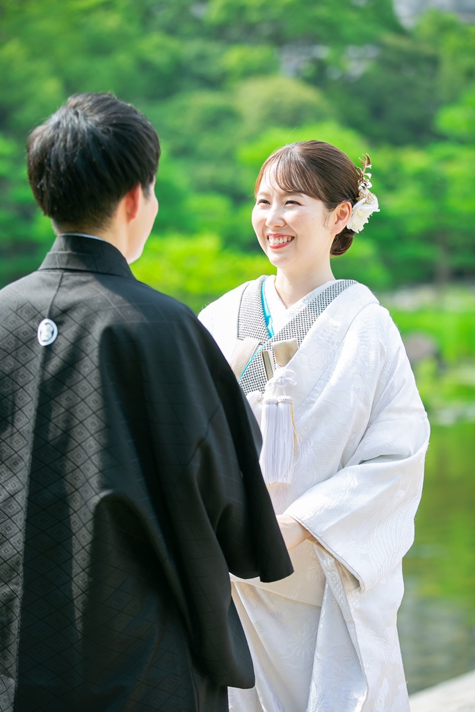 - We had our location shoot at Shirotori Garden wearing a shiromuku (pure white wedding kimono). In addition to the elegant shiromuku, I was also able to pair it with a beautifully colored kakeshita, allowing us to capture photos that we truly love! Shirotori Garden itself is a stunning location filled with water and lush greenery, and I was so happy to have photos taken in the tea room with the exact composition I had always dreamed of!