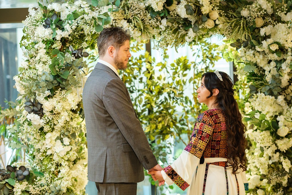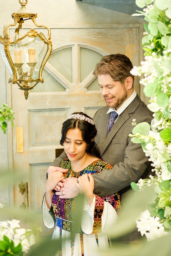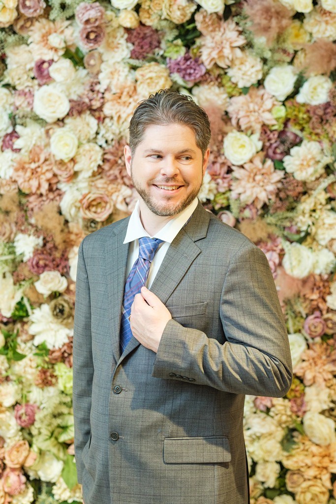 Surrounded by studio flowers and greenery for the shoot