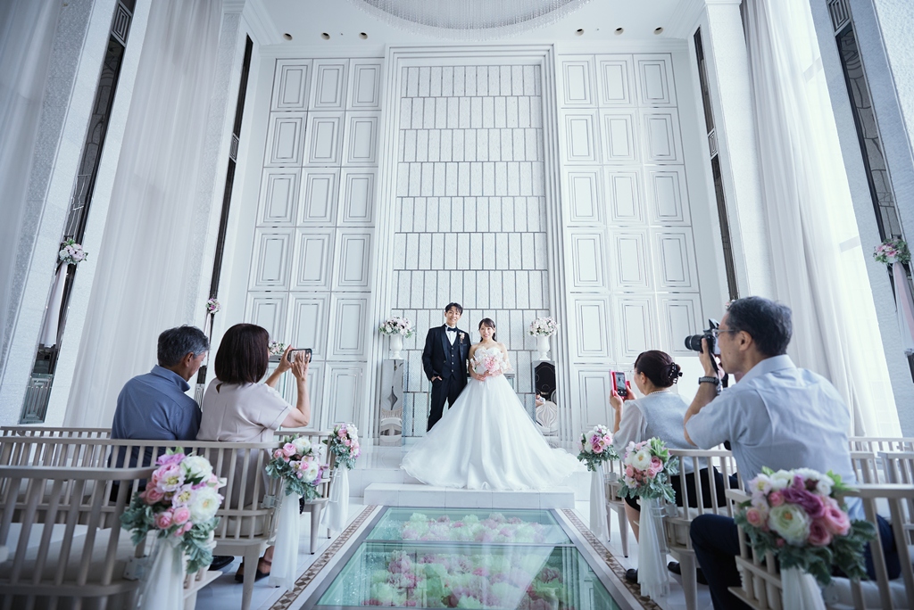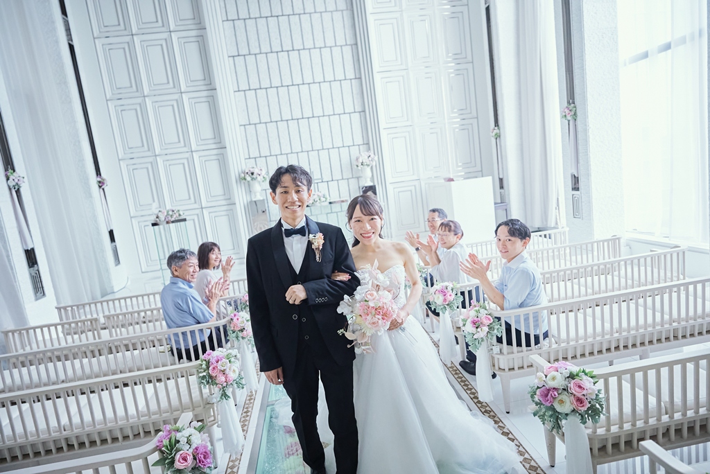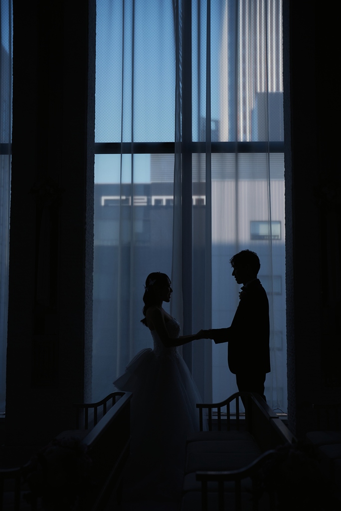 It was truly memorable to see the two of you surrounded by the gentle light streaming through the sacred chapel space, with your radiant smiles, the pure white wedding dress, and the dignified tuxedo appearance shining even brighter.